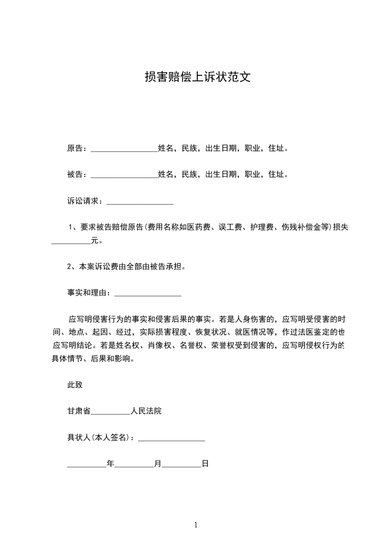 1、要求被告赔偿原告(费用名称如医药费、误工费、护理费、伤残补偿金等)损失__________元。