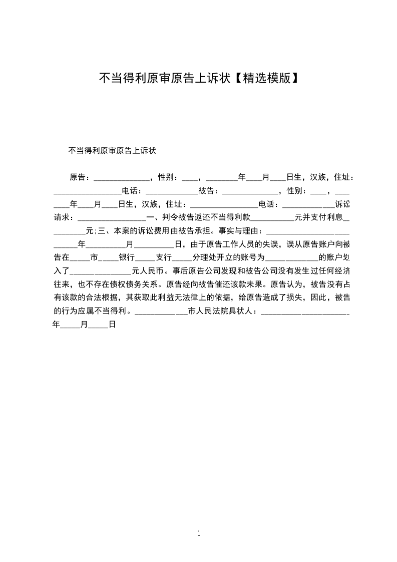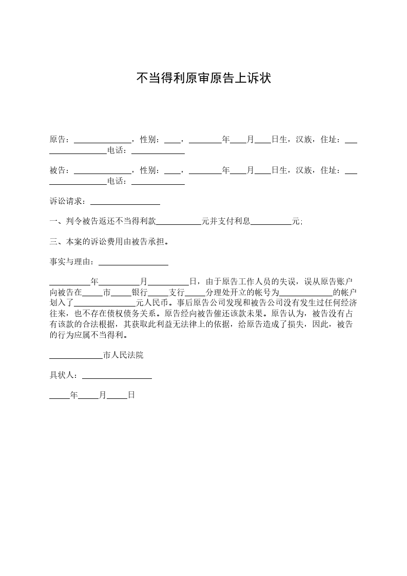 原告:______________,性别:____,________年____月____日生,汉族,住址:_________________电话:_____________ 被告:______________,性别:____,________年____月____日生,汉族,住址:_________________电话:_____________ 诉讼请求:_________________ 一、判令被告返还不当得利款___________元并支付利息__________元; 三、本案的诉讼费用由被告承担。 事实与理由:_________________ __________年__________月__________日,由于原告工作人员的失误,误从原告账户向被告在_____市_____银行_____支行_____分理处开立的帐号为_____________的账户划入了_______________元人民币。事后原告公司发现和被告公司没有发生过任何经济往来,也不存在债权债务关系。原告经向被告催还该款未果。原告认为,被告没有占有该款的合法根据,其获取此利益无法律上的依据,给原告造成了损失,因此,被告的行为应属不当得利。 _____________市人民法院 具状人:_________________ _____年_____月_____日