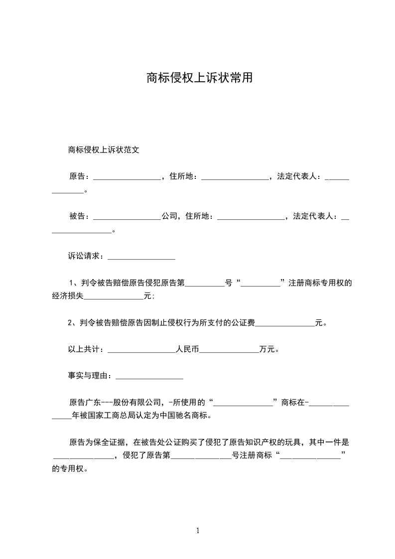 原告:_________________广东__________股份有限公司,住所地:_________________广东省汕头市__________工业园,法定代表人:______________。 被告:_________________公司,住所地:_________________,法定代表人:_________________。 诉讼请求:_________________ 1、判令被告赔偿原告侵犯原告第__________号“__________”注册商标专用权的经济损失_______________元; 2、判令被告赔偿原告因制止侵权行为所支付的公证费_______________元。 以上共计:_________________人民币_______________万元。 事实与理由:_________________ 原告广东---股份有限公司,-所使用的“_______________”商标在-_______________年被国家工商总局认定为中国驰名商标。 原告为保全证据,在被告处公证购买了侵犯了原告知识产权的玩具,其中一件是_______________,侵犯了原告第_______________号注册商标“_______________”的专用权。 被告故意销售侵犯原告上述权利的商品,获取非法利益,该行为已构成对原告知识产权的侵犯。 被告故意销售侵犯原告上述权利的商品,获取非法利益,依法应当承担相应的赔偿责任。依据《中华人民共和国商标法》第五十六条第二款规定:_________________“侵权人因侵权所得利益,或者被侵权人因被侵权所受损失难以确定的,由人民法院根据侵权行为的情节判决给予五十万元以下的赔偿。” 据此,原告为维护自身的合法利益,特向贵院提起诉讼,请求依法支持原告的全部诉讼请求。 据此,原告为维护自身的合法权益,特向贵院提起诉讼,请求依法支持原告的全部诉讼请求。 此致 广州知识产权法院 具状人:______________ 二零一__________年__________月__________日