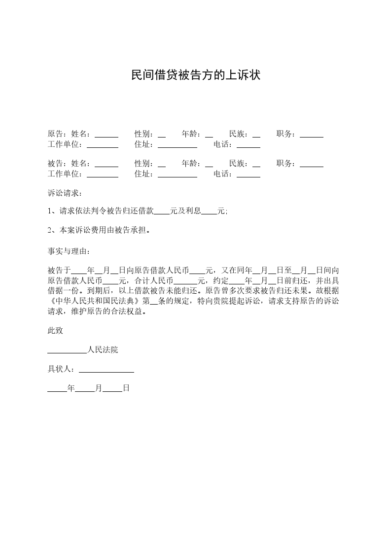 原告:姓名:______ 性别:__ 年龄:__ 民族:__ 职务:______ 工作单位:________ 住址:__________ 电话:______ 被告:姓名:______ 性别:__ 年龄:__ 民族:__ 职务:______ 工作单位:________ 住址:__________ 电话:______ 诉讼请求: 1、请求依法判令被告归还借款____元及利息____元; 2、本案诉讼费用由被告承担。 事实与理由: 被告于____年__月__日向原告借款人民币____元,又在同年__月__日至__月__日间向原告借款人民币____元,合计人民币______元,约定____年__月__日前归还,并出具借据一份。到期后,以上借款被告未能归还。原告曾多次要求被告归还未果。故根据《中华人民共和国民法典》第__条的规定,特向贵院提起诉讼,请求支持原告的诉讼请求,维护原告的合法权益。 此致 __________人民法院 具状人:______________ _____年_____月_____日
