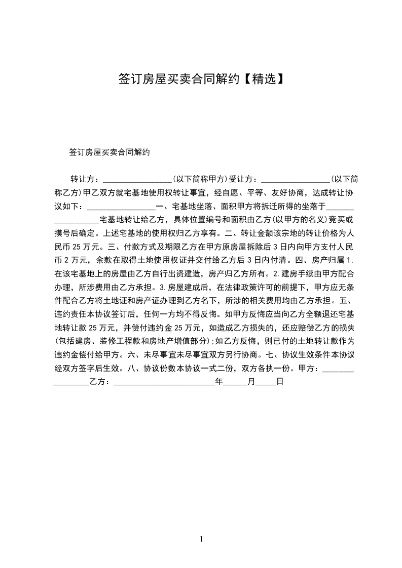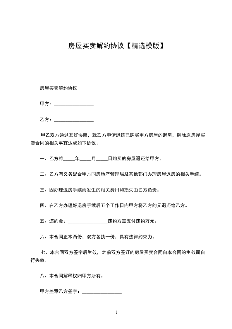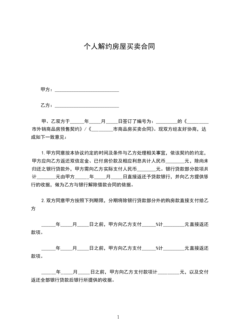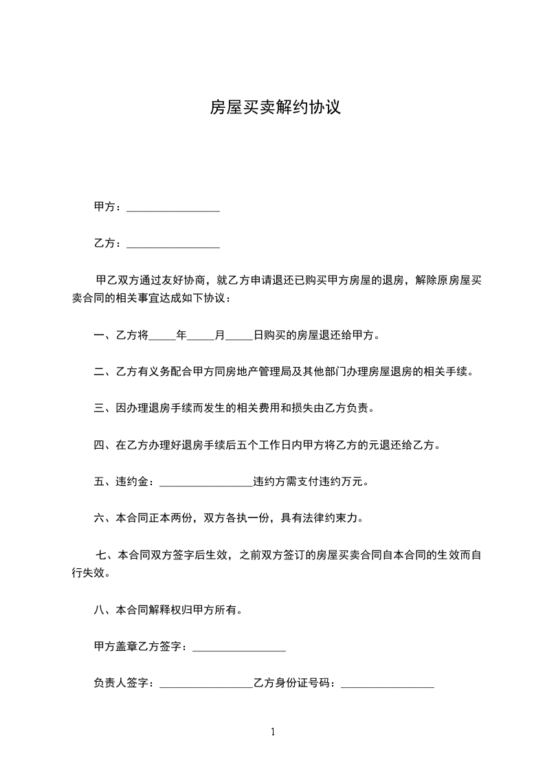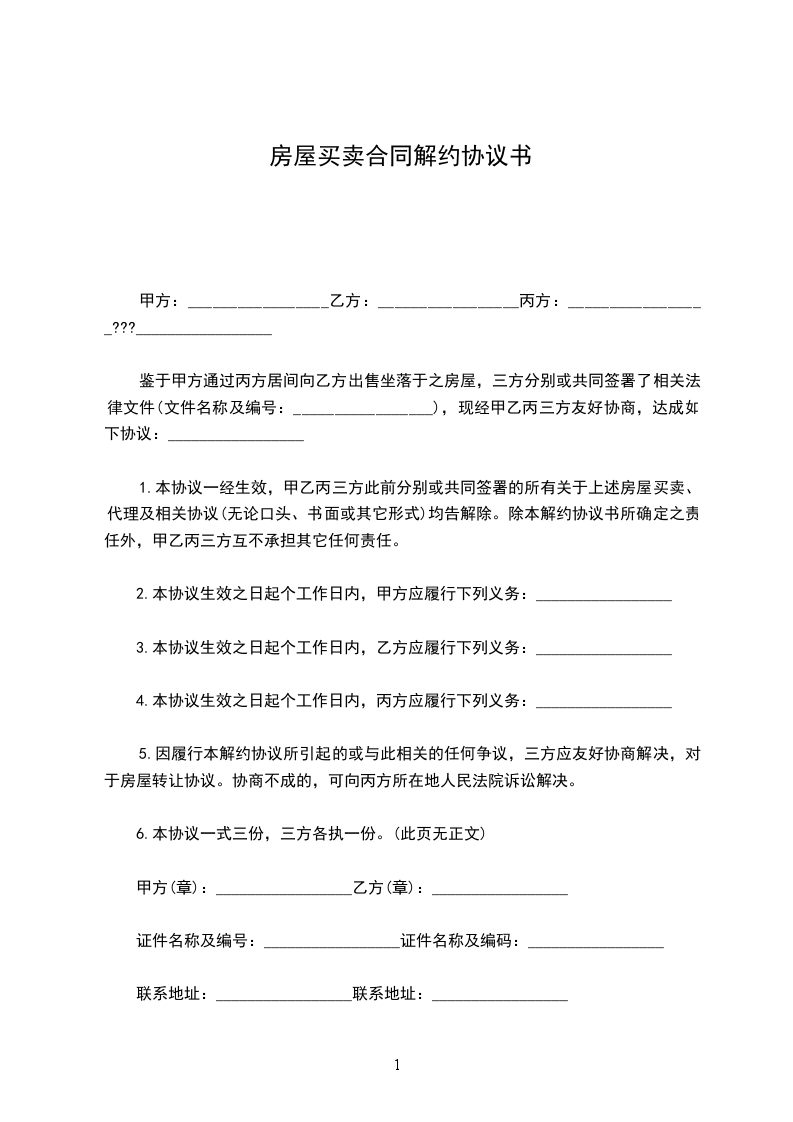 1.本协议一经生效,甲乙丙三方此前分别或共同签署的所有关于上述房屋买卖、代理及相关协议(无论口头、书面或其它形式)均告解除。除本解约协议书所确定之责任外,甲乙丙三方互不承担其它任何责任。