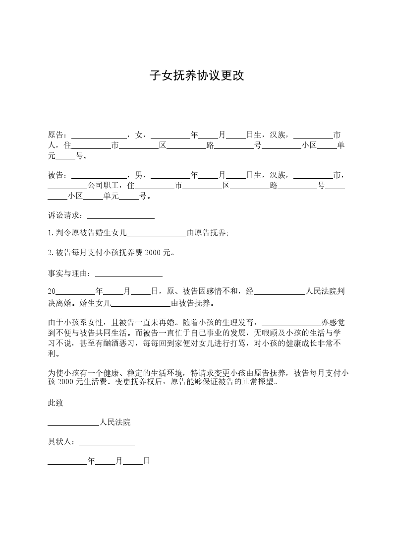 原告:______________,女,__________年_____月_____日生,汉族,__________市人,住__________市__________区__________路__________号__________小区_____单元_____号。 被告:______________,男,__________年_____月_____日生,汉族,__________市,__________公司职工,住__________市__________区__________路__________号__________小区_____单元_____号。 诉讼请求:_________________ 1.判令原被告婚生女儿_______________由原告抚养; 2.被告每月支付小孩抚养费2000元。 事实与理由:_________________ 20__________年_____月_____日,原、被告因感情不和,经_____________人民法院判决离婚。婚生女儿_______________由被告抚养。 由于小孩系女性,且被告一直未再婚。随着小孩的生理发育,_______________亦感觉到不便与被告共同生活。而被告一直忙于自己事业的发展,无暇顾及小孩的生活与学习不说,甚至有酗酒恶习,每每回到家便对女儿进行打骂,对小孩的健康成长非常不利。 为使小孩有一个健康、稳定的生活环境,特请求变更小孩由原告抚养,被告每月支付小孩2000元生活费。变更抚养权后,原告能够保证被告的正常探望。 此致 _____________人民法院 具状人:______________ __________年_____月_____日