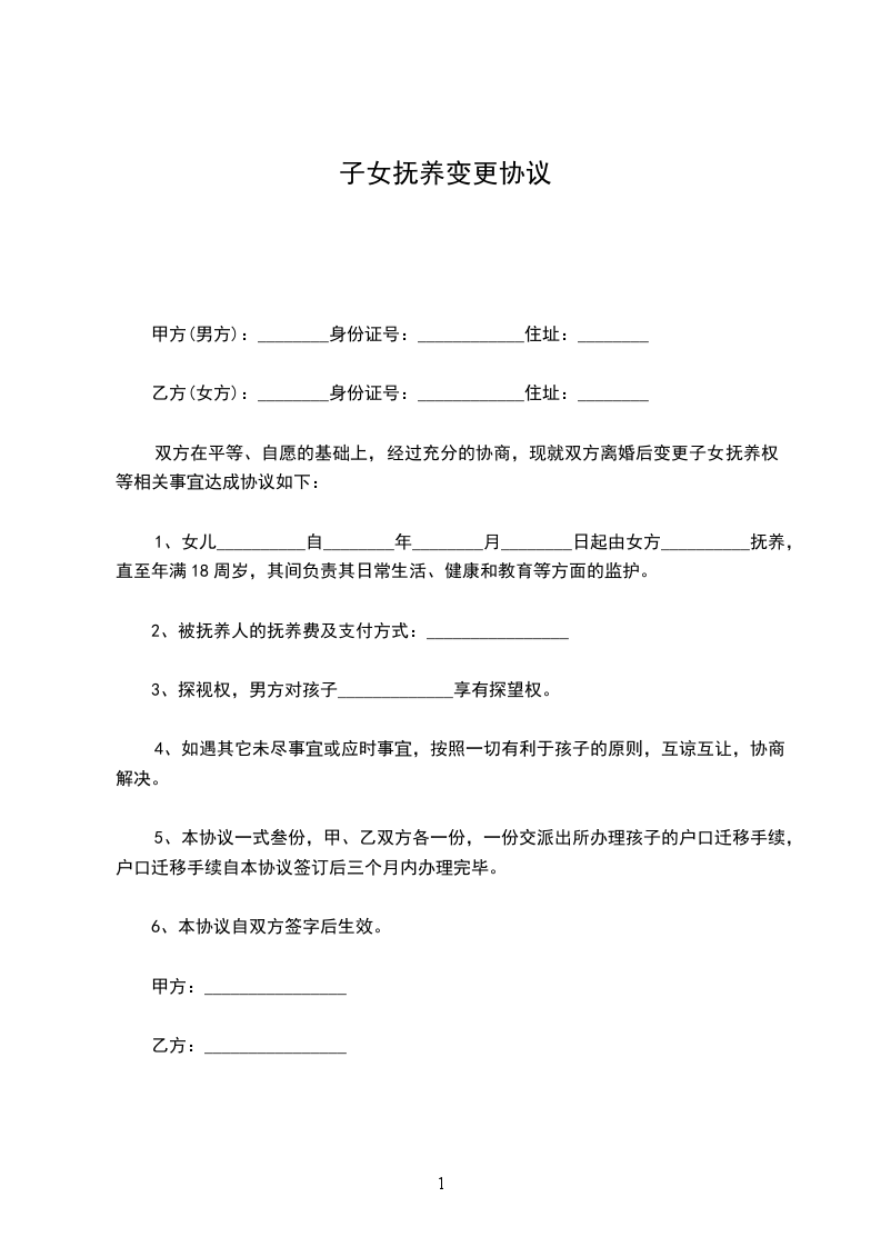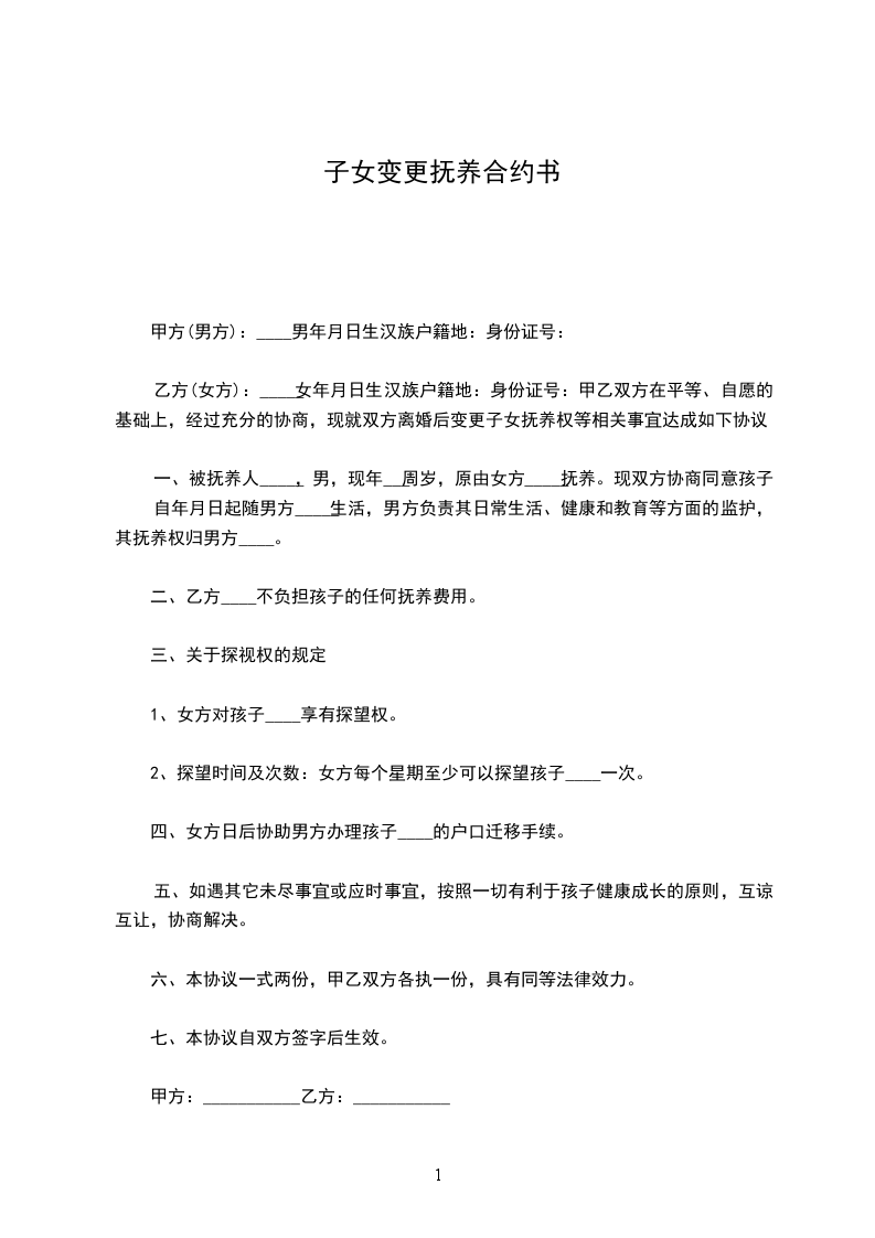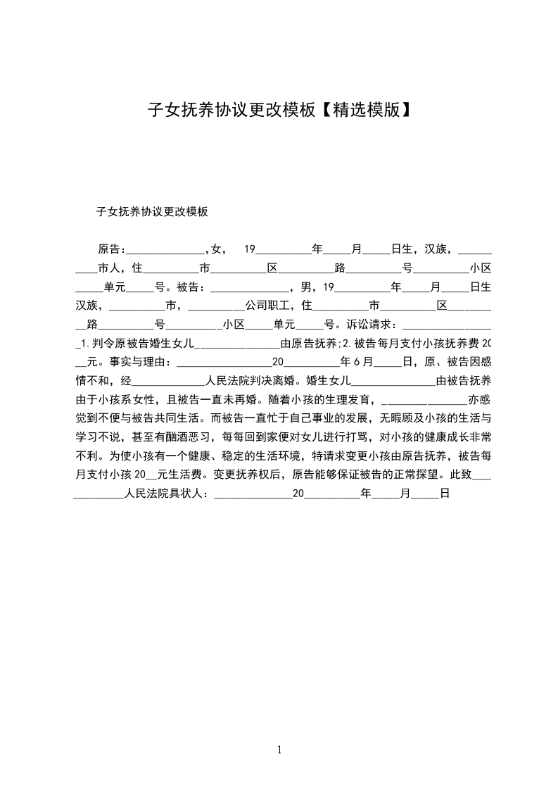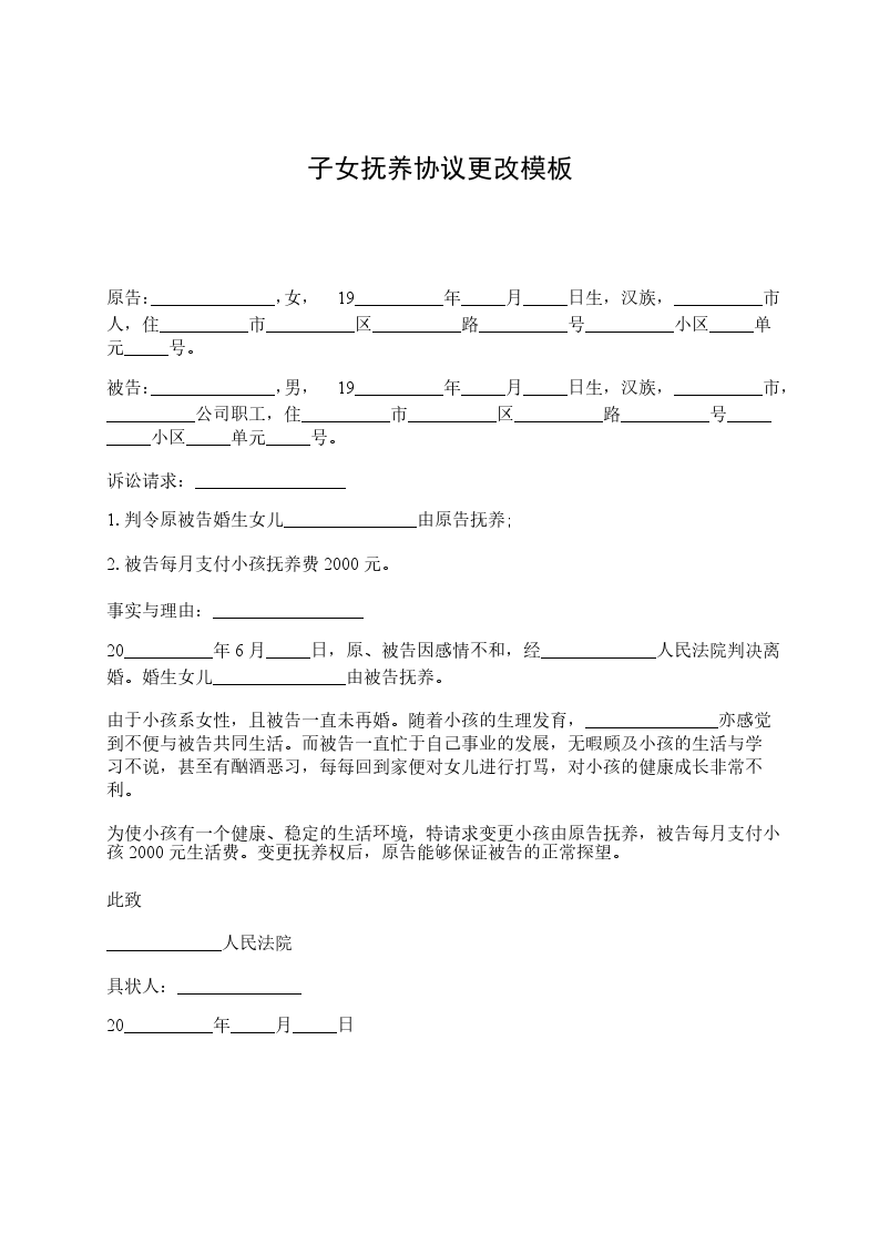 原告:______________,女,19__________年_____月_____日生,汉族,__________市人,住__________市__________区__________路__________号__________小区_____单元_____号。 被告:______________,男,19__________年_____月_____日生,汉族,__________市,__________公司职工,住__________市__________区__________路__________号__________小区_____单元_____号。 诉讼请求:_________________ 1.判令原被告婚生女儿_______________由原告抚养; 2.被告每月支付小孩抚养费2000元。 事实与理由:_________________ 20__________年6月_____日,原、被告因感情不和,经_____________人民法院判决离婚。婚生女儿_______________由被告抚养。 由于小孩系女性,且被告一直未再婚。随着小孩的生理发育,_______________亦感觉到不便与被告共同生活。而被告一直忙于自己事业的发展,无暇顾及小孩的生活与学习不说,甚至有酗酒恶习,每每回到家便对女儿进行打骂,对小孩的健康成长非常不利。 为使小孩有一个健康、稳定的生活环境,特请求变更小孩由原告抚养,被告每月支付小孩2000元生活费。变更抚养权后,原告能够保证被告的正常探望。 此致 _____________人民法院 具状人:______________ 20__________年_____月_____日
