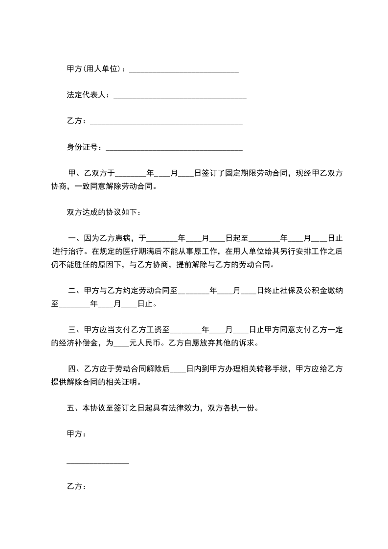 甲乙双方于_____年_____月_____日签订为期_____年的劳动合同,现甲乙双方同意解除劳动合同关系。经双方协商一致,签订本协议如下:_________________