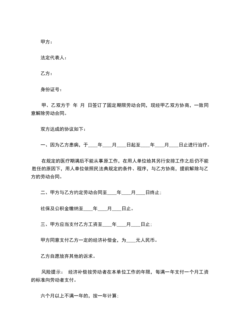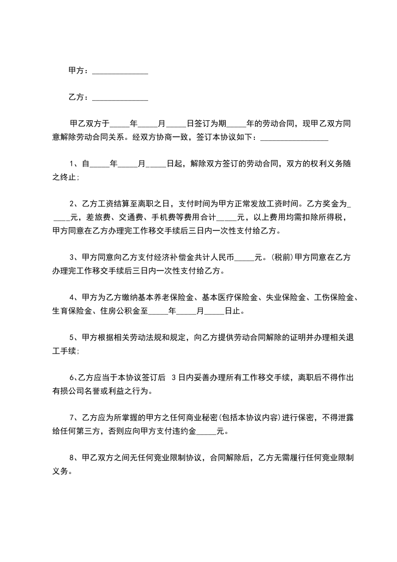 1、自_____年_____月_____日起,解除双方签订的劳动合同,双方的权利义务随之终止;
