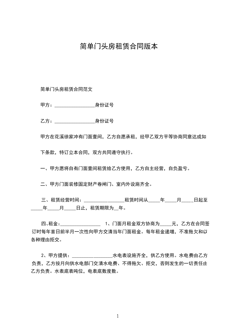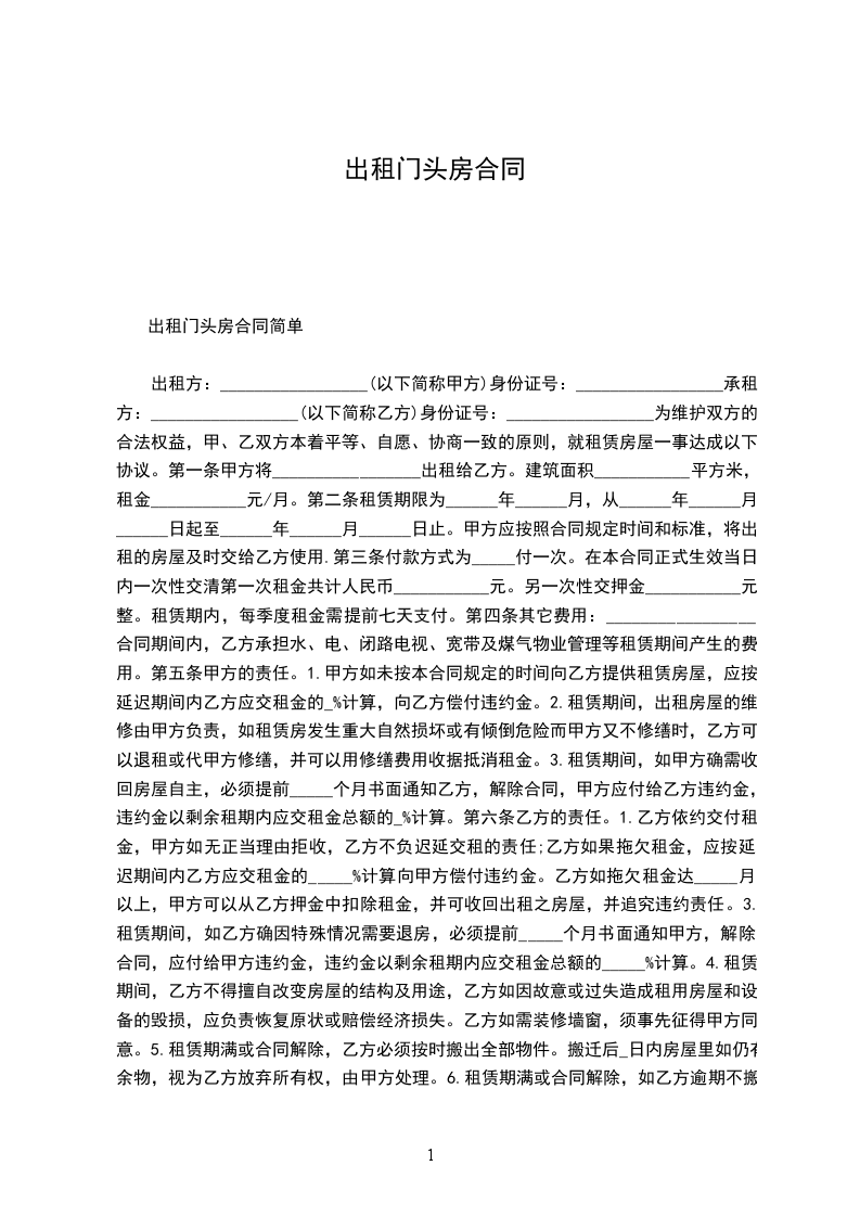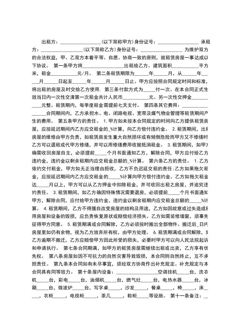 出租方:_________________(以下简称甲方)身份证号:_________________ 承租方:_________________(以下简称乙方)身份证号:_________________ 为维护双方的合法权益,甲、乙双方本着平等、自愿、协商一致的原则,就租赁房屋一事达成以下协议。 第一条甲方将_________________出租给乙方。建筑面积___________平方米,租金___________元/月。 第二条租赁期限为______年______月,从______年______月______日起至______年______月______日止。甲方应按照合同规定时间和标准,将出租的房屋及时交给乙方使用. 第三条付款方式为_____付一次。在本合同正式生效当日内一次性交清第一次租金共计人民币___________元。另一次性交押金___________元整。租赁期内,每季度租金需提前七天支付。 第四条其它费用:_________________合同期间内,乙方承担水、电、闭路电视、宽带及煤气物业管理等租赁期间产生的费用。 第五条甲方的责任。 1.甲方如未按本合同规定的时间向乙方提供租赁房屋,应按延迟期间内乙方应交租金的_%计算,向乙方偿付违约金。 2.租赁期间,出租房屋的维修由甲方负责,如租赁房发生重大自然损坏或有倾倒危险而甲方又不修缮时,乙方可以退租或代甲方修缮,并可以用修缮费用收据抵消租金。 3.租赁期间,如甲方确需收回房屋自主,必须提前_____个月书面通知乙方,解除合同,甲方应付给乙方违约金,违约金以剩余租期内应交租金总额的_%计算。 第六条乙方的责任。 1.乙方依约交付租金,甲方如无正当理由拒收,乙方不负迟延交租的责任;乙方如果拖欠租金,应按延迟期间内乙方应交租金的_____%计算向甲方偿付违约金。乙方如拖欠租金达_____月以上,甲方可以从乙方押金中扣除租金,并可收回出租之房屋,并追究违约责任。 3.租赁期间,如乙方确因特殊情况需要退房,必须提前_____个月书面通知甲方,解除合同,应付给甲方违约金,违约金以剩余租期内应交租金总额的_____%计算。 4.租赁期间,乙方不得擅自改变房屋的结构及用途,乙方如因故意或过失造成租用房屋和设备的毁损,应负责恢复原状或赔偿经济损失。乙方如需装修墙窗,须事先征得甲方同意。 5.租赁期满或合同解除,乙方必须按时搬出全部物件。搬迁后_日内房屋里如仍有余物,视为乙方放弃所有权,由甲方处理。 6.租赁期满或合同解除,如乙方逾期不搬迁,乙方应赔偿甲方因此所受的损失,必要时甲方可以向人民法院起诉和申请执行。 第七条合同期满,如甲方的租赁房屋需继续出租或出卖,乙方享有优先权。 第八条房屋如因不可抗力的自然灾害导致毁损,本合同则自然终止,互不承担责任。 第九条本合同如有未尽事宜,须经双方协商作出补充规定。补充规定与本合同具有同等效力。 第十条屋内设备:_________________空调挂机_____台,洗衣机_____台,彩电_____台,油烟机_____台,燃气灶_____台,电热水器_____台,冰箱_____台,微波炉_____台,写字桌_____,沙发_____,餐桌_____,椅_____,床_____,衣柜_____,电视柜_____,茶几_____,鞋柜_____等设施。 第十一条备注:_________________(合同期满归还,遗失照价赔偿) 煤气卡_____张门卡_____张钥匙_____把 本合同执行中如发生纠纷,应通过甲乙双方协商解决。协商不成,可提请当地房管部门调解或人民法院裁决。 本合同一式二份,甲、乙双方各执一份,签字生效。 出租人:_________________联系电话:_________________ 承租人:_________________联系电话:_________________