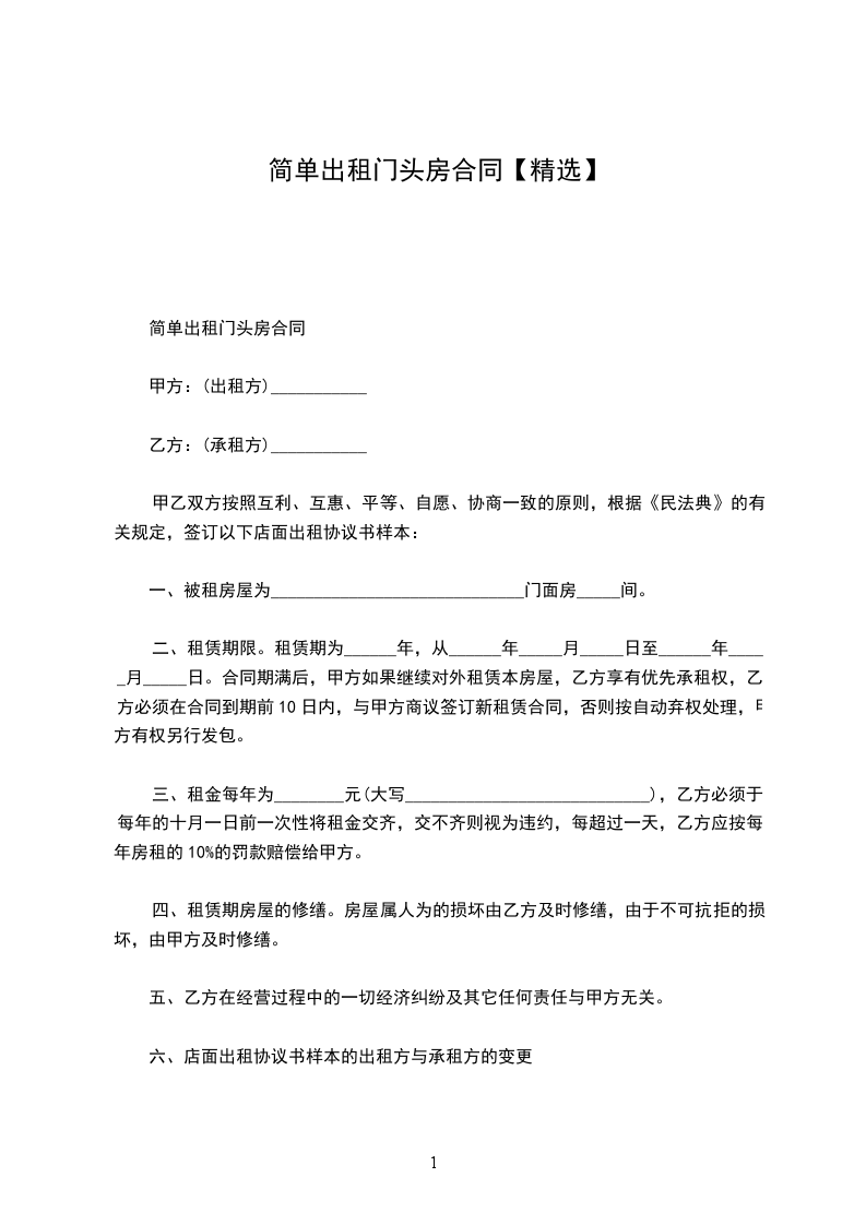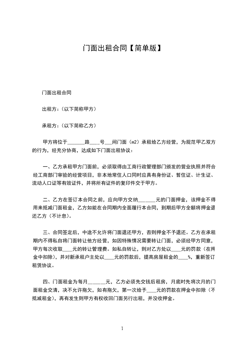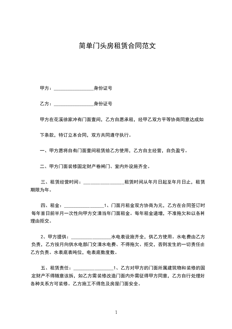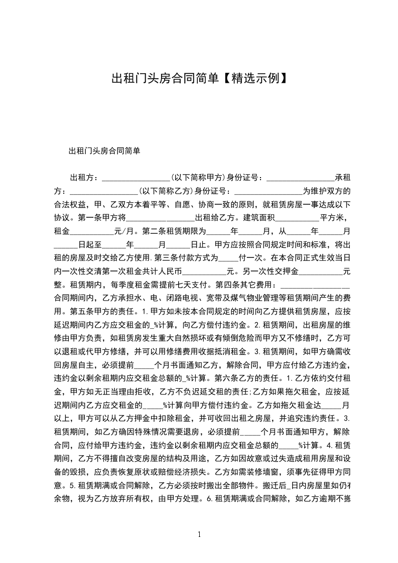 出租方:_________________(以下简称甲方)身份证号:_________________ 承租方:_________________(以下简称乙方)身份证号:_________________ 为维护双方的合法权益,甲、乙双方本着平等、自愿、协商一致的原则,就租赁房屋一事达成以下协议。 第一条甲方将_________________出租给乙方。建筑面积___________平方米,租金___________元/月。 第二条租赁期限为______年______月,从______年______月______日起至______年______月______日止。甲方应按照合同规定时间和标准,将出租的房屋及时交给乙方使用. 第三条付款方式为_____付一次。在本合同正式生效当日内一次性交清第一次租金共计人民币___________元。另一次性交押金___________元整。租赁期内,每季度租金需提前七天支付。 第四条其它费用:_________________合同期间内,乙方承担水、电、闭路电视、宽带及煤气物业管理等租赁期间产生的费用。 第五条甲方的责任。 1.甲方如未按本合同规定的时间向乙方提供租赁房屋,应按延迟期间内乙方应交租金的_%计算,向乙方偿付违约金。 2.租赁期间,出租房屋的维修由甲方负责,如租赁房发生重大自然损坏或有倾倒危险而甲方又不修缮时,乙方可以退租或代甲方修缮,并可以用修缮费用收据抵消租金。 3.租赁期间,如甲方确需收回房屋自主,必须提前_____个月书面通知乙方,解除合同,甲方应付给乙方违约金,违约金以剩余租期内应交租金总额的_%计算。 第六条乙方的责任。 1.乙方依约交付租金,甲方如无正当理由拒收,乙方不负迟延交租的责任;乙方如果拖欠租金,应按延迟期间内乙方应交租金的_____%计算向甲方偿付违约金。乙方如拖欠租金达_____月以上,甲方可以从乙方押金中扣除租金,并可收回出租之房屋,并追究违约责任。 3.租赁期间,如乙方确因特殊情况需要退房,必须提前_____个月书面通知甲方,解除合同,应付给甲方违约金,违约金以剩余租期内应交租金总额的_____%计算。 4.租赁期间,乙方不得擅自改变房屋的结构及用途,乙方如因故意或过失造成租用房屋和设备的毁损,应负责恢复原状或赔偿经济损失。乙方如需装修墙窗,须事先征得甲方同意。 5.租赁期满或合同解除,乙方必须按时搬出全部物件。搬迁后_日内房屋里如仍有余物,视为乙方放弃所有权,由甲方处理。 6.租赁期满或合同解除,如乙方逾期不搬迁,乙方应赔偿甲方因此所受的损失,必要时甲方可以向人民法院起诉和申请执行。 第七条合同期满,如甲方的租赁房屋需继续出租或出卖,乙方享有优先权。 第八条房屋如因不可抗力的自然灾害导致毁损,本合同则自然终止,互不承担责任。 第九条本合同如有未尽事宜,须经双方协商作出补充规定。补充规定与本合同具有同等效力。 第十条屋内设备:_________________空调挂机_____台,洗衣机_____台,彩电_____台,油烟机_____台,燃气灶_____台,电热水器_____台,冰箱_____台,微波炉_____台,写字桌_____,沙发_____,餐桌_____,椅_____,床_____,衣柜_____,电视柜_____,茶几_____,鞋柜_____等设施。 第十一条备注:_________________(合同期满归还,遗失照价赔偿) 煤气卡_____张门卡_____张钥匙_____把 本合同执行中如发生纠纷,应通过甲乙双方协商解决。协商不成,可提请当地房管部门调解或人民法院裁决。 本合同一式二份,甲、乙双方各执一份,签字生效。 出租人:_________________联系电话:_________________ 承租人:_________________联系电话:_________________