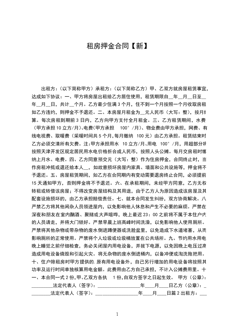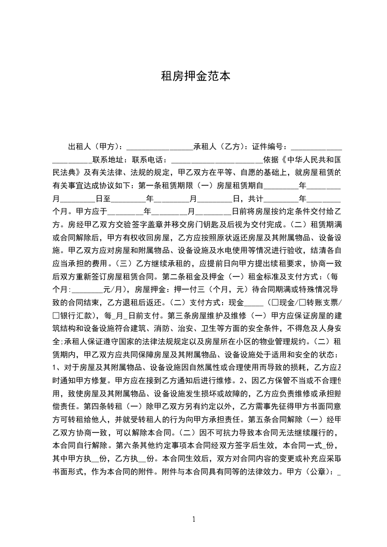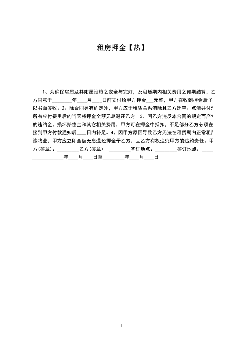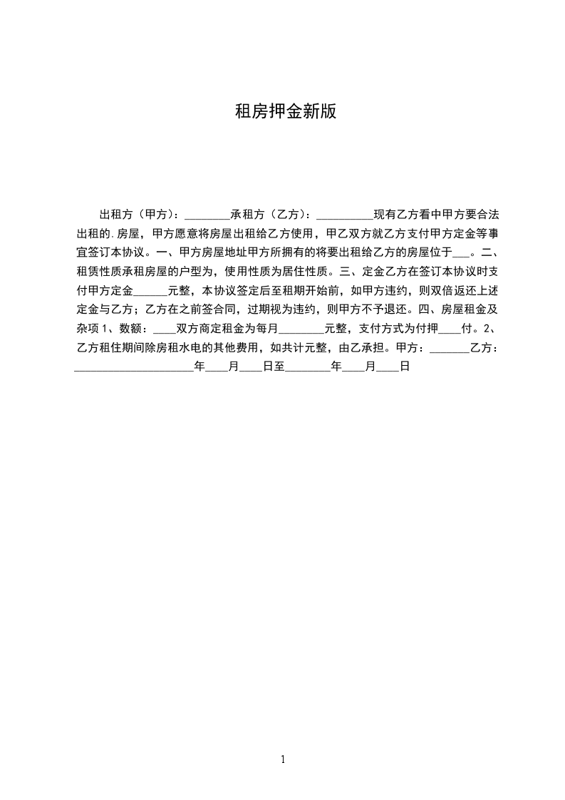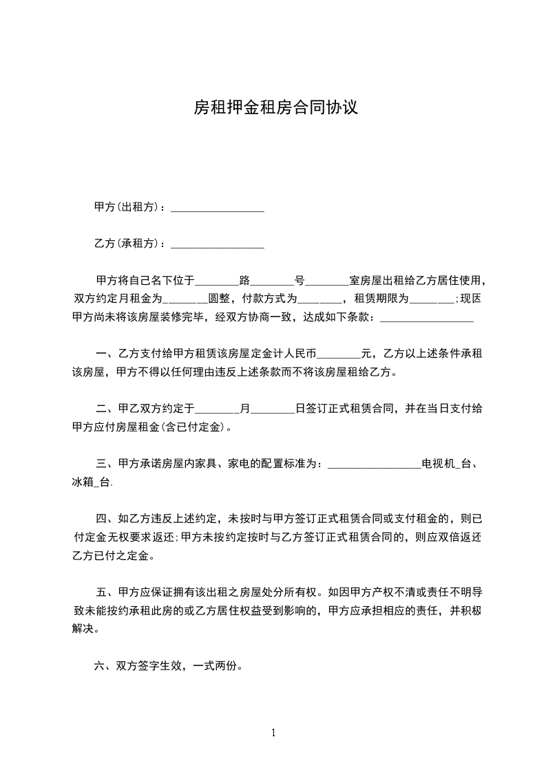 一、乙方支付给甲方租赁该房屋定金计人民币________元,乙方以上述条件承租该房屋,甲方不得以任何理由违反上述条款而不将该房屋租给乙方。
