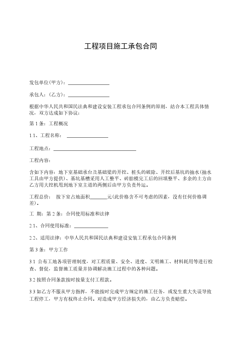 发包单位(甲方):_________________ 承包人:(乙方):_________________ 根据中华人民共和国民法典和建设安装工程承包合同条例的原则,结合本工程具体情况,双方达成如下协议: 第1条:工程概况 1.1、工程名称: _________________ 工程地点:__________________________________ 工程内容: 含如下内容:地下室基础承台及基础梁的开挖、桩头的破除、开挖后基坑的抽水(抽水工具由甲方提供)、基坑基槽采用人工整平、砖胎模完工后的回填整平、多余的土方由乙方用大挖机甩到地下室主道的两侧后由甲方负责外运。 工程总价: 按下室占地面积_______元(此价格含不可考虑的因素,没有任何价格调差)。 工 期:第2条:合同使用标准和法律 2.1、合同使用标准:______________ 2.2、适用法律:中华人民共和国民法典和建设安装工程承包合同条例 第3条:甲方工作 3.1 公布工地各项管理制度,对工程质量、安全、进度、文明施工、材料耗用等进行检查、督促,监督施工质量并协调解决施工过程中的各种问题。 3.2按照合同条款按时按量支付工程款。 3.3如乙方不服从甲方指挥,不能按时完成甲方规定的施工任务,或发生重大失误导致工程停工,甲方有权终止合同。对造成甲方经济损失的,由乙方负责赔偿。 3.4负责加强安全管理、完善安全规章制度,做好安全设防。 3.5对乙方违反各种管理制度、操作规程、安全生产、文明施工规定的人员甲方有权清理出施工现场。乙方不服从甲方现场施工员的安排,不能按时、按量、按要求完成施工任务(或整改内容)的,甲方有权另行安排人员完成,造成的一切费用均由乙方负责,对消极对待、屡教不改的,甲方有权终止协议;中途退场的,甲方有权不付任何工资费用。 第4条:乙方工作 4.1乙方须安排一个负责人长期呆在现场协调工作,至该工作内容全部完成为止, 4.2 乙方严格按照甲方测量出的桩顶标高进行破除,标高测量中乙方必须派人员配合,严禁用炮机凿除,人工破除过程中不能伤及桩钢筋,破除后的桩头必须保持平整完好。预留钢筋必须按甲方的要求所预留。破除完的的桩头由乙方用挖机吊出基坑,并掩埋在车库底板以下。 4.3 前期进场必须保证有一台大挖机和两台小挖机方可开始施工,施工中乙方必须按照甲方的进度相应的增加机械人员,如进度达不到要求,甲方有权终止合同,并按完成的50%结算。 4.4 乙方进场后,甲方负责提供住宿及生活水电,乙方自带破桩工具(包括空压机)。在施工过程中,甲、乙双方必须紧密配合,确保施工进度以保证工程的如期完成。乙方人员在施工中必须注意安全,上班必须安全帽,穿胶鞋,如发生安全事故,由乙方完全负责,严格遵守公司的各项安全,生产制度和各种生活制度。另乙方必须保证施工进度,如进度严重跟不上,甲方有权中止乙方的合作。 第5条:工程款 工程款支付金额和时间:按地下室后浇带分成六块,每块垫层砼完成后按完成工程量的70%支付一次工程款,其余款项待地下室垫层全部浇筑完一周内全部付清,甲方违约的责任:甲方不按期付款,乙方有权停工,甲方应承担乙方停工期间的一切损失。乙方所收的工程款不含任何税金,乙方只提供收款收据。 第6条:合同的生效与终止 合同签字之日起生效,工程完成、工程款全部付清后合同自行终止。 第7条:合同份数:甲乙双方各执2份。 第8条:合同款未尽事宜,经双方协商后,用补充协议补充或协商解决。 甲方(公章):_________ 乙方(公章):_________ 法定代表人(签字):_________ 法定代表人(签字):_________ _________年____月____日 _________年____月____日