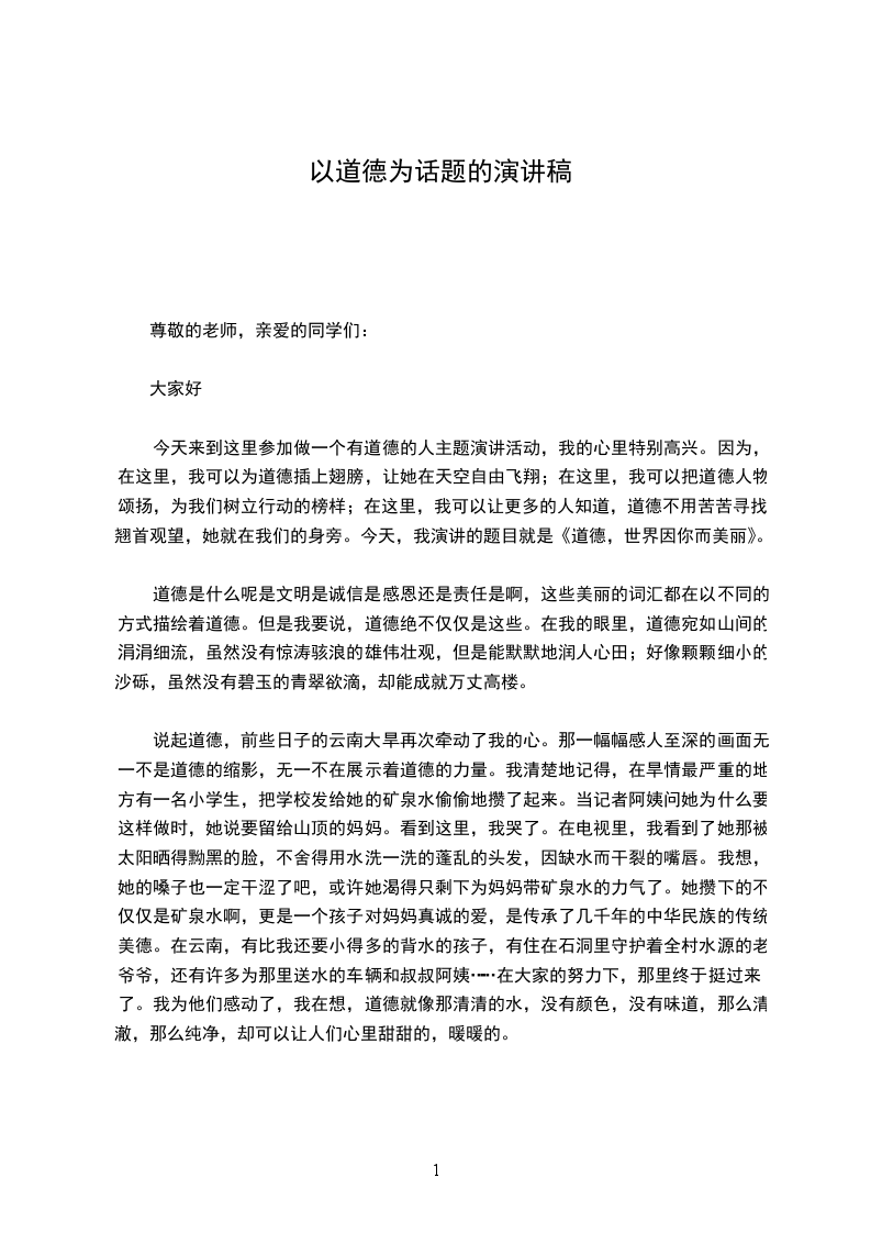 今天来到这里参加做一个有道德的人主题演讲活动,我的心里特别高兴。因为,在这里,我可以为道德插上翅膀,让她在天空自由飞翔;在这里,我可以把道德人物颂扬,为我们树立行动的榜样;在这里,我可以让更多的人知道,道德不用苦苦寻找,翘首观望,她就在我们的身旁。今天,我演讲的题目就是《道德,世界因你而美丽》。