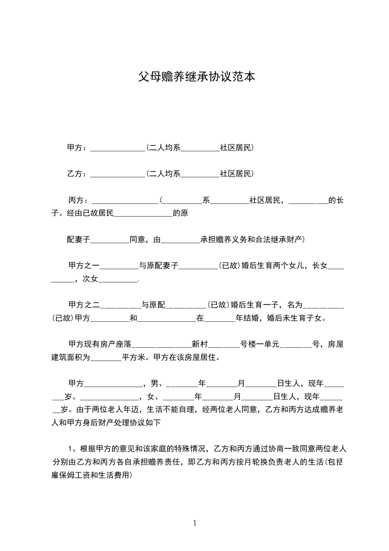甲方_______________,男、________年________月________日生人,现年________岁。_______________,女、________年________月________日生人,现年________岁。由于两位老人年迈,生活不能自理,经两位老人同意,乙方和丙方达成赡养老人和甲方身后财产处理协议如下