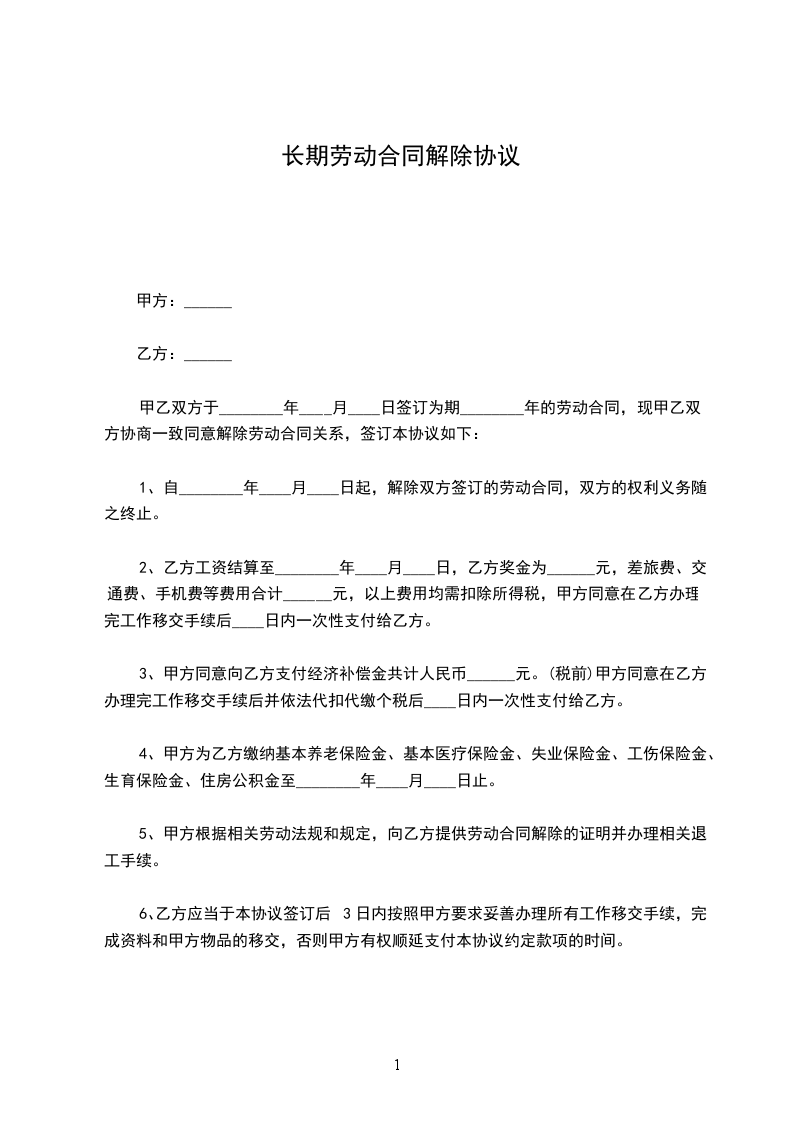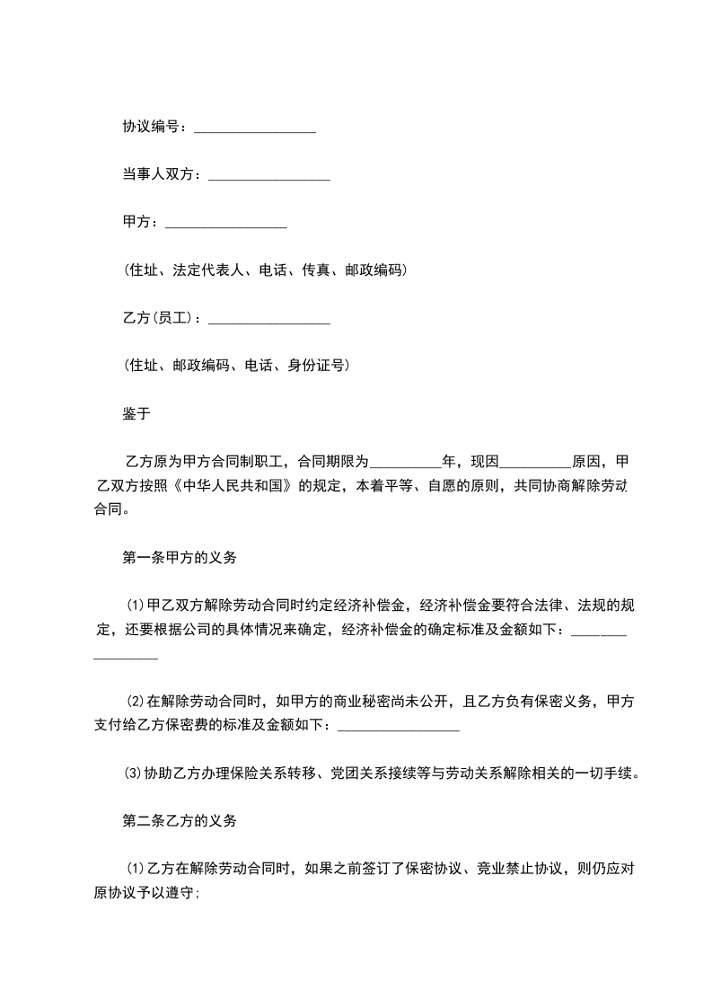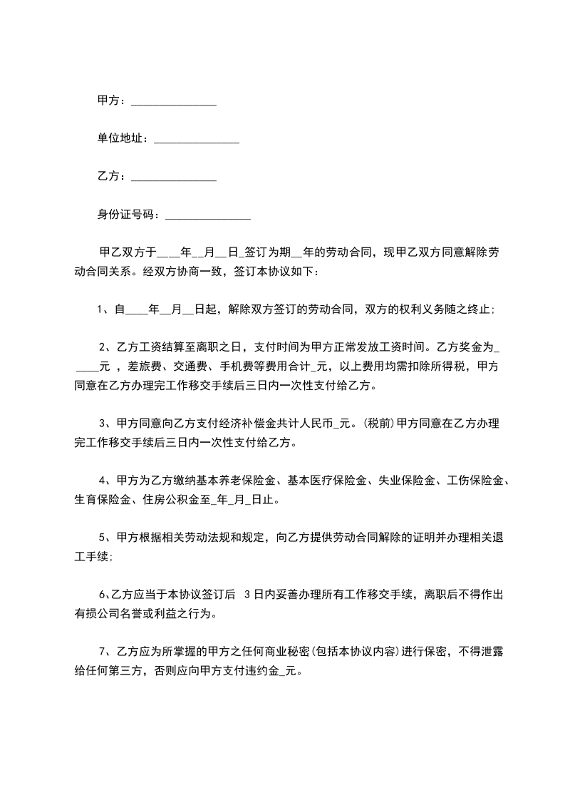 从签订本协议起,甲乙双方原劳动合同即行解除。本协议一式两份,双方各持一份。