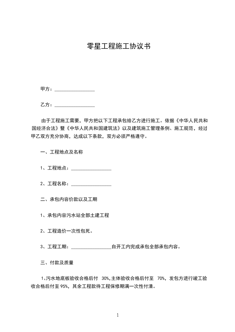 1、污水地底板验收合格后付30%,主体验收合格后付至70%,发包方进行竣工验收合格后付至95%,其余工程款待工程保修期满一次性付清。
