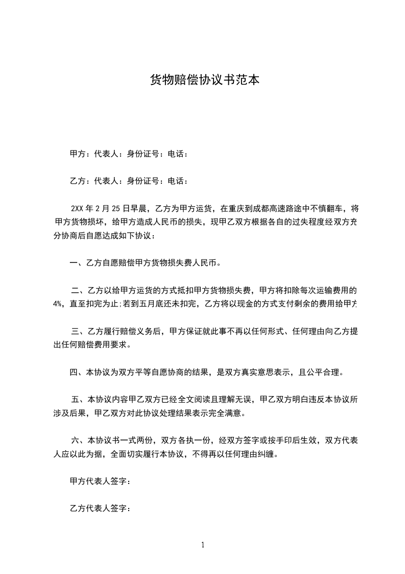 2XX年2月25日早晨,乙方为甲方运货,在重庆到成都高速路途中不慎翻车,将甲方货物损坏,给甲方造成人民币的损失,现甲乙双方根据各自的过失程度经双方充分协商后自愿达成如下协议: