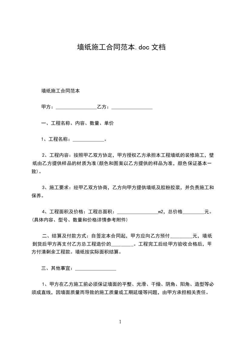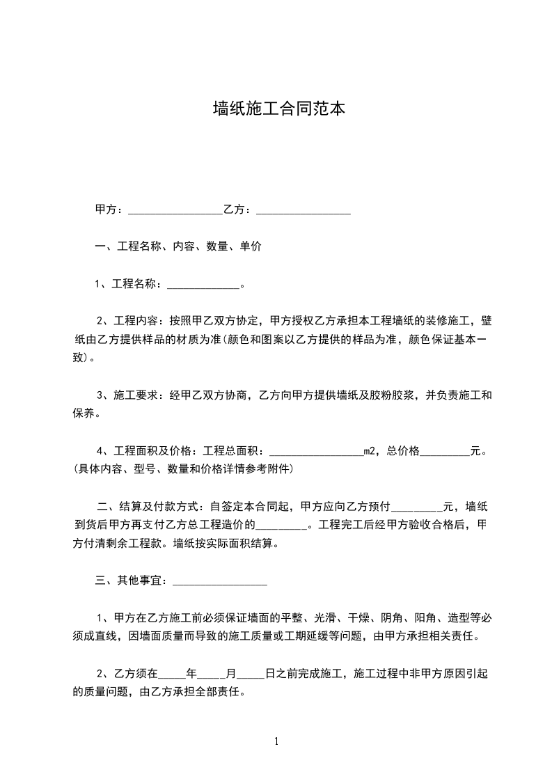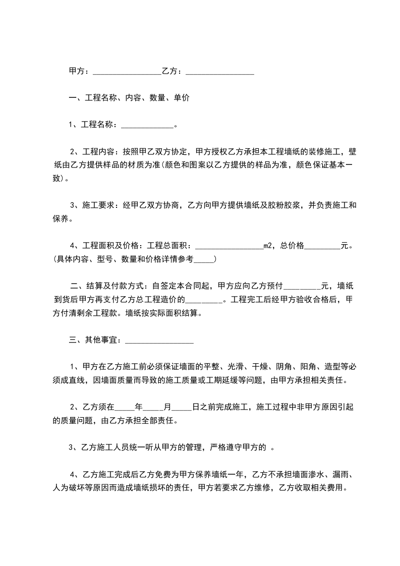 3、施工要求:经甲乙双方协商,乙方向甲方提供墙纸及胶粉胶浆,并负责施工和保养。