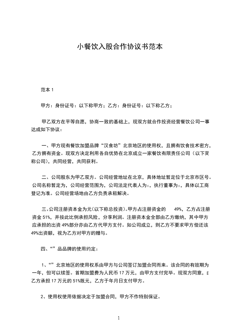 一、甲方现有餐饮加盟品牌“汉食坊”北京地区的使用权,且拥有饮食技术密方,乙方拥有资金。现双方决定利用各自优势在北京成立一家餐饮有限责任公司(以下简称公司),共同经营,共同获利。