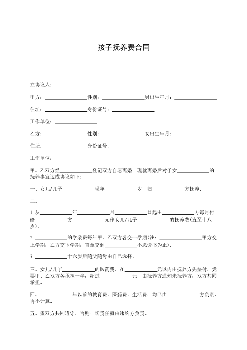 立协议人:_________________ 甲方:_________________性别:_________________男出生年月:_________________ 住址:_________________身份证号:_________________ 工作单位:_________________ 乙方:_________________性别:_________________女出生年月:_________________ 住址:_________________身份证号:_________________ 工作单位:_________________ 甲、乙双方经_____________登记双方自愿离婚,现就离婚后对子女_____________的抚养事宜达成协议如下:_________________ 一、女儿/儿子_____________现年_____________岁,归_____________方抚养。 二、 1.从_____________年_____________月_____________日起由_____________方每月付给_____________方_____________元作女儿/儿子_____________的抚养费(直至十八岁)。 2._____________的学杂费每年甲、乙双方各交一学期(注:_________________甲方交上学期,乙方交下学期,直至交到_____________不愿读书为止)。 3._____________十六岁后随父随母由自己选择。 三、女儿/儿子_____________的医药费,在_____________元以内由抚养方先垫付,凭票甲、乙双方各承担一半,超过_____________元,由抚养方通知未抚养方,双方共同承担。 四、_____________年以前的教育费、医药费、生活费,均已由_____________方负责,再不计算。 五、望双方共同遵守,否则一切责任概由违约方负责。 子女抚养协议书此协议一式贰份,甲、乙双方各一份,此协议签字生效。 甲方(签字):_________________乙方:_________________(签字):_________________ _____________年__________月__________日_____________年__________月__________日
