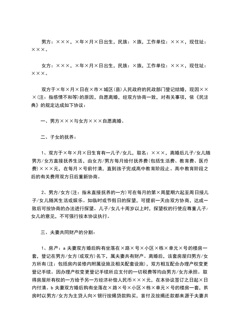 双方于×年×月×日在×市×城区(县)人民政府的民政部门登记结婚,现因×××(注:指感情不和等)的原因,自愿离婚,经双方协商一致,对有关事项,依《民法典》的规定达成如下协议: