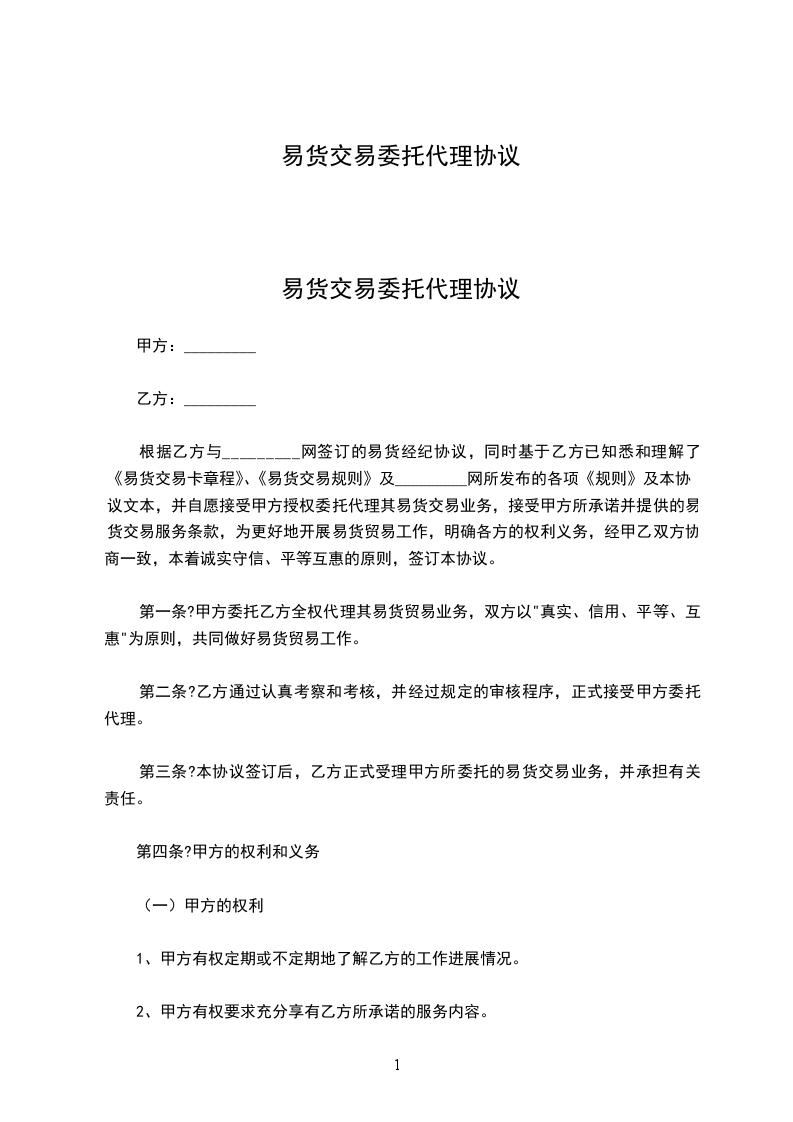 根据乙方与_________网签订的易货经纪协议,同时基于乙方已知悉和理解了《易货交易卡章程》、《易货交易规则》及_________网所发布的各项《规则》及本协议文本,并自愿接受甲方授权委托代理其易货交易业务,接受甲方所承诺并提供的易货交易服务条款,为更好地开展易货贸易工作,明确各方的权利义务,经甲乙双方协商一致,本着诚实守信、平等互惠的原则,签订本协议。