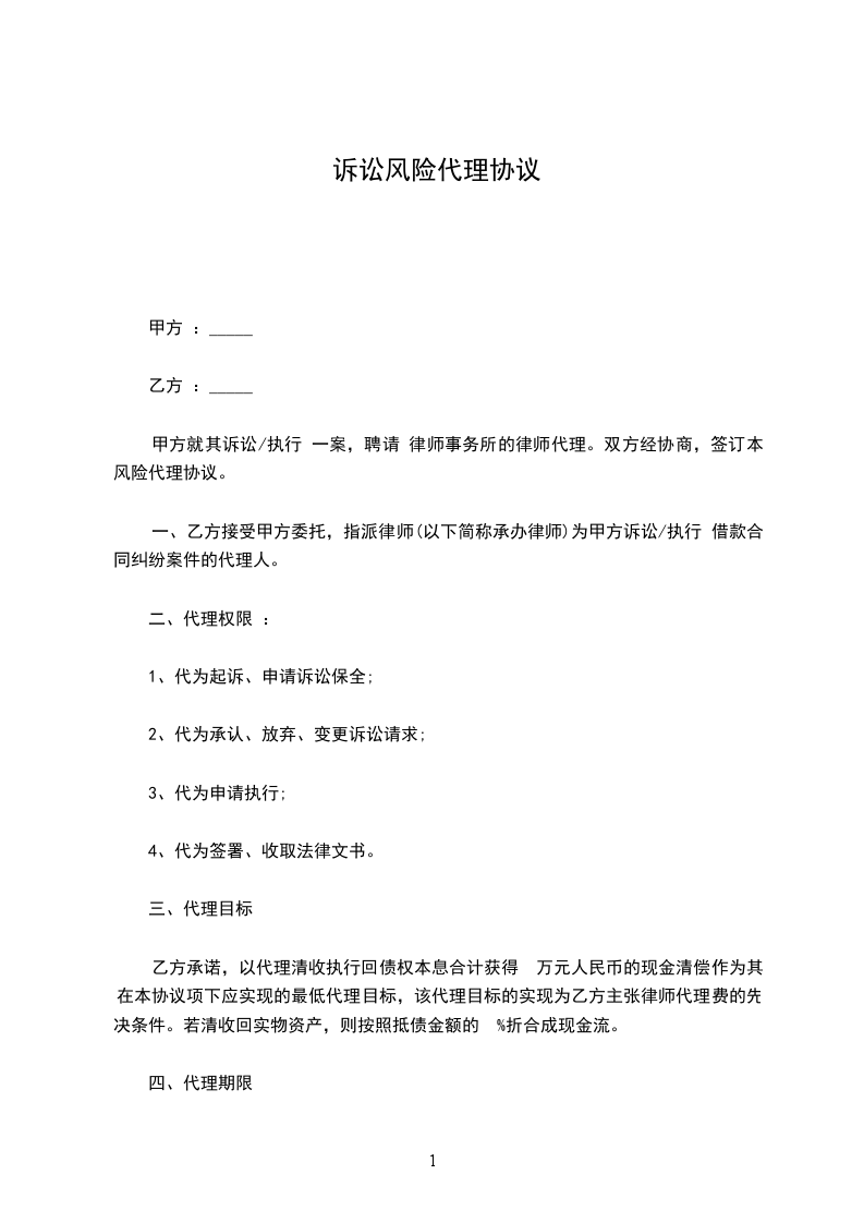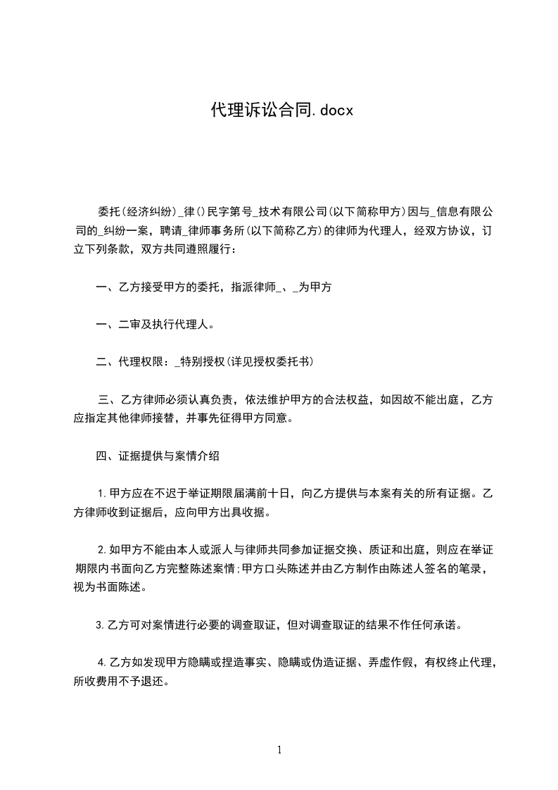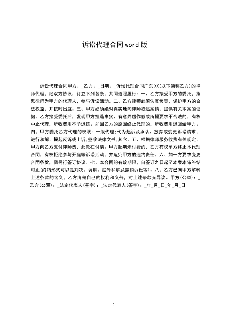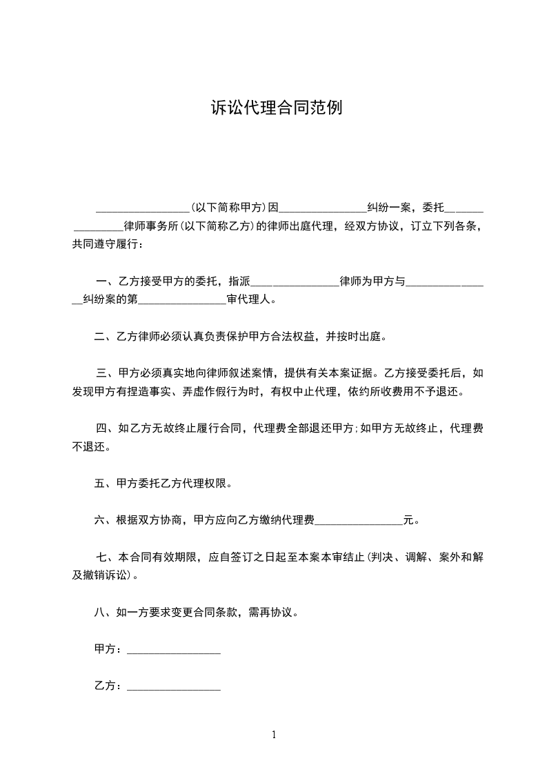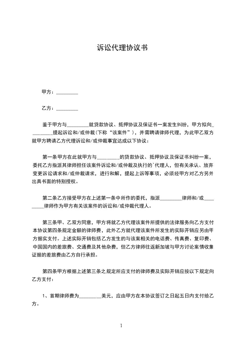 一、乙方接受甲方的委托,指派________________律师为甲方与________________纠纷案的第________________审代理人。