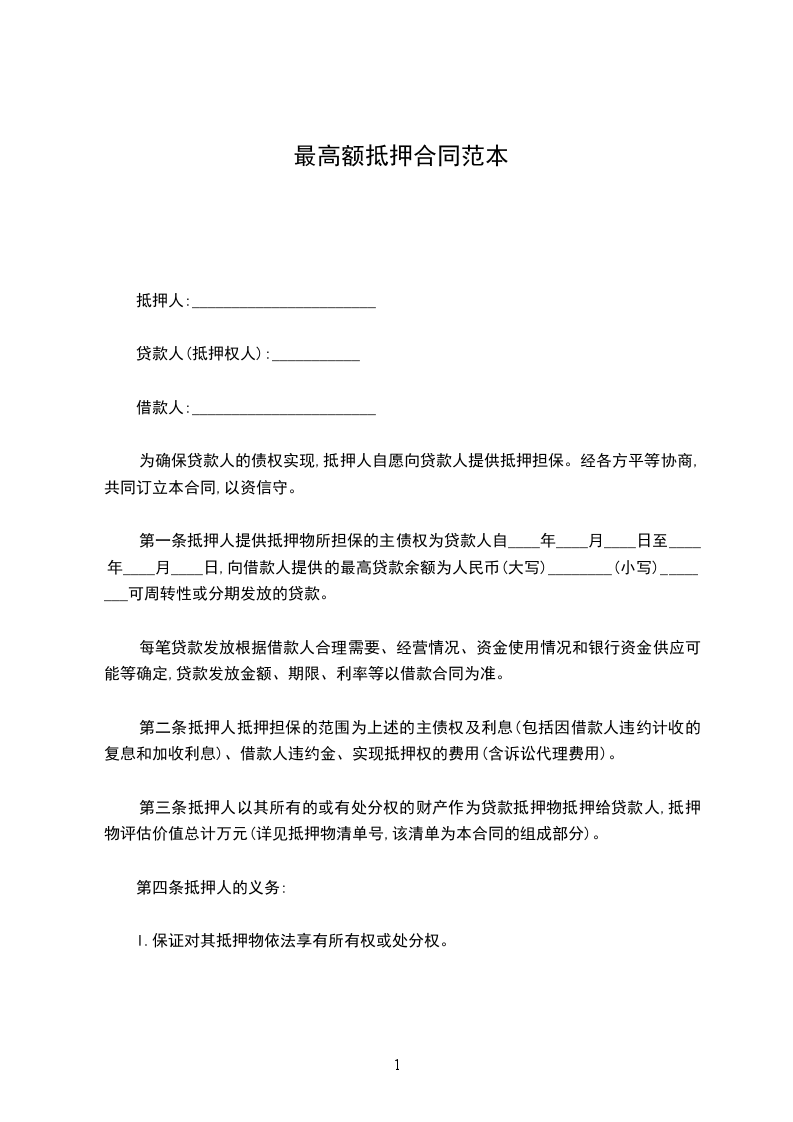 第一条抵押人提供抵押物所担保的主债权为贷款人自____年____月____日至____年____月____日,向借款人提供的最高贷款余额为人民币(大写)________(小写)________可周转性或分期发放的贷款。