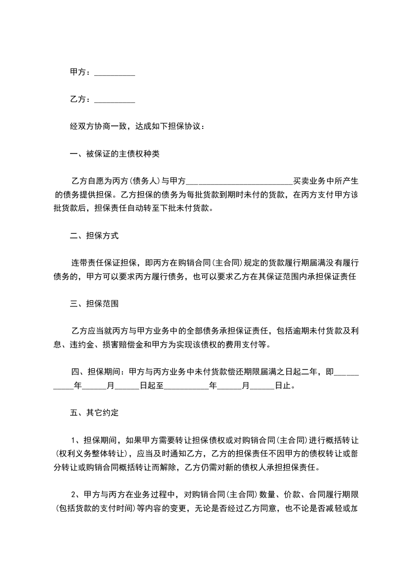 丙方根据甲方与乙方在__________年_____月_____日签订的金额为_______________的购销合同向甲方提供担保,担保合同从属于购销合同,担保金额可累计,最终担保金额以财务结算金额为准。