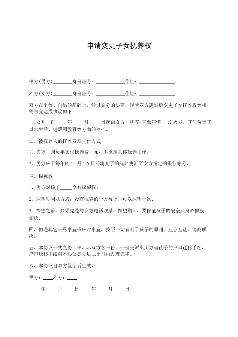 甲方(男方)________身份证号:____________住址:_______________ 乙方(女方)________身份证号:____________住址:_______________ 双方在平等、自愿的基础上,经过充分的协商,现就双方离婚后变更子女抚养权等相关事宜达成协议如下: 一、女儿__自_____年_____月_____日起由女方__抚养,直至年满18周岁,其间负责其日常生活、健康和教育等方面的监护。 二、被抚养人的抚养费及支付方式 1、男方__则每年支付抚养费__元,不承担具体抚养工作。 2、男方应于每年的12月1-5日前将儿子的抚养费汇至女方指定的银行帐号。 三、探视权 1、男方对孩子_____享有探望权。 2、探望时间及方式,没有抚养的一方每个月可以探望一次。 3、探望之前,必须先经与女方电话联系。探望期间,要保证孩子的安全及身心健康、愉快。 四、如遇其它未尽事宜或应时事宜,按照一切有利于孩子的原则,互谅互让,协商解决。 五、本协议一式叁份,甲、乙双方各一份,一份交派出所办理孩子的户口迁移手续,户口迁移手续自本协议签订后三个月内办理完毕。 六、本协议自双方签字后生效。 甲方:____乙方:____ _____年_____月_____日_____年_____月_____日