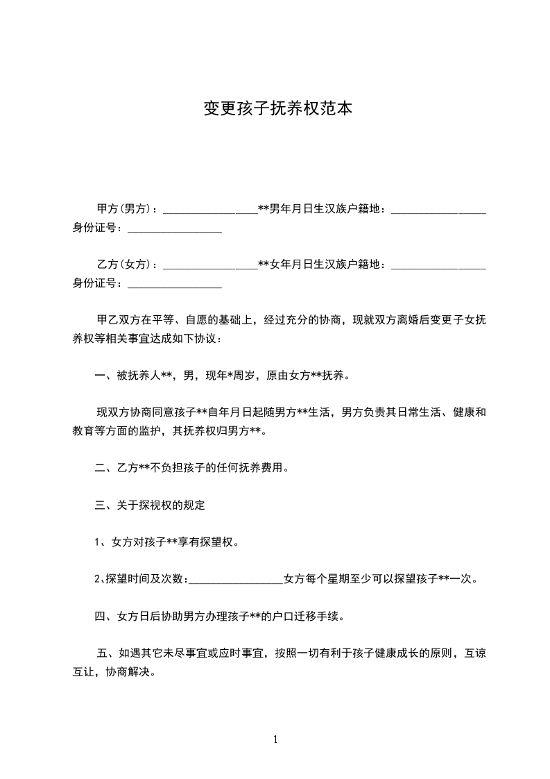 甲乙双方在平等、自愿的基础上,经过充分的协商,现就双方离婚后变更子女抚养权等相关事宜达成如下协议: