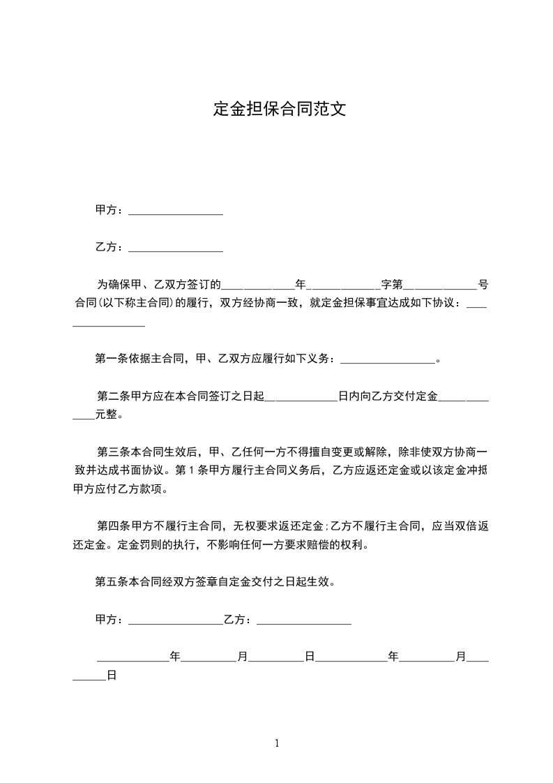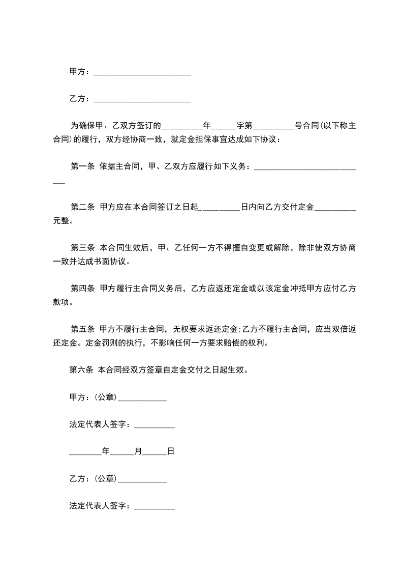 第二条甲方应在本合同签订之日起_____________日内向乙方交付定金_____________元整。