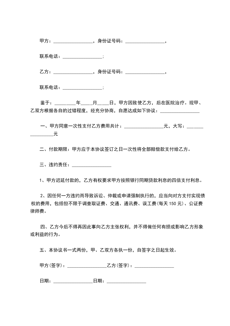 鉴于:_________年_____月_____日,甲方因致使乙方,后在医院治疗。现甲、乙双方根据各自的过错程度,经充分协商,自愿达成如下协议:_________________