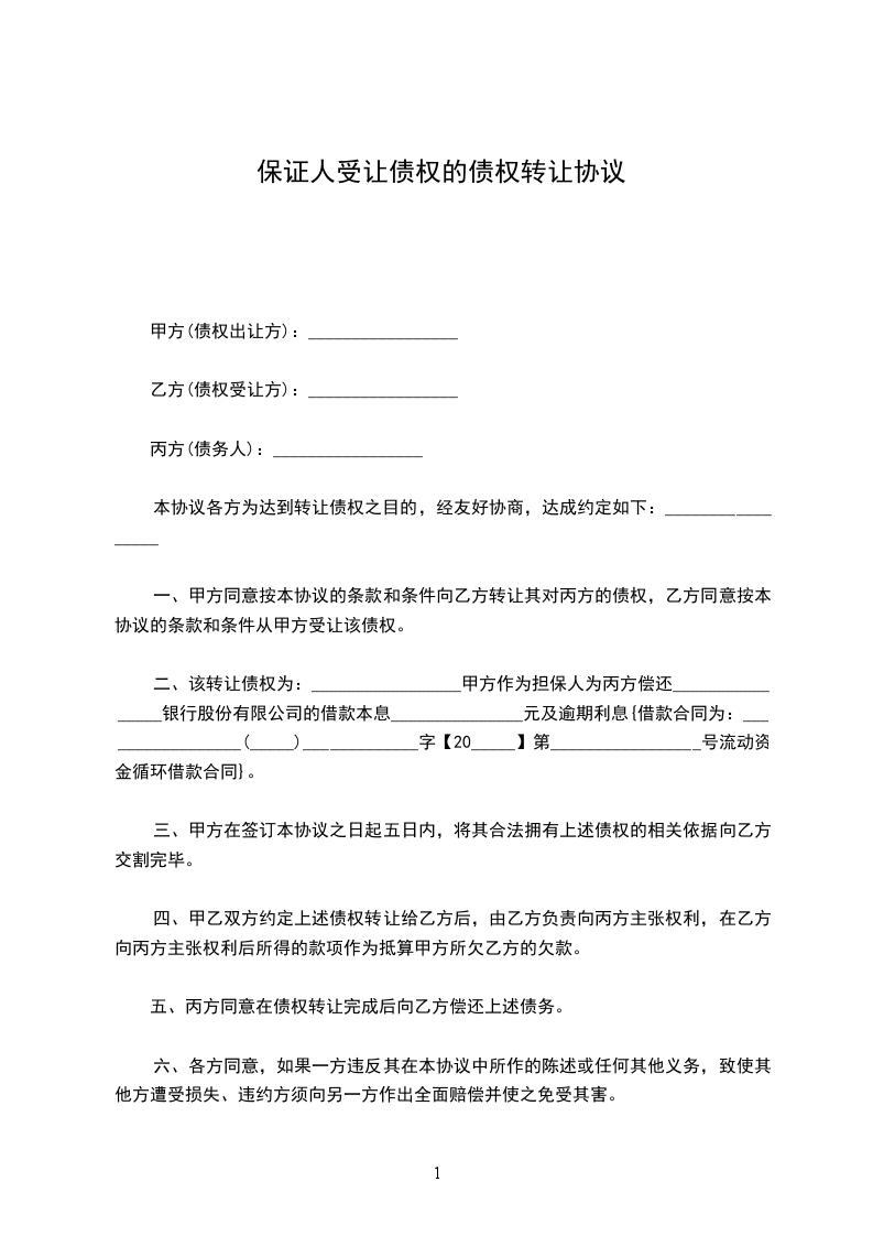 二、该转让债权为:_________________甲方作为担保人为丙方偿还________________银行股份有限公司的借款本息_______________元及逾期利息{借款合同为:_________________(_____)_____________字【20_____】第_________________号流动资金循环借款合同}。