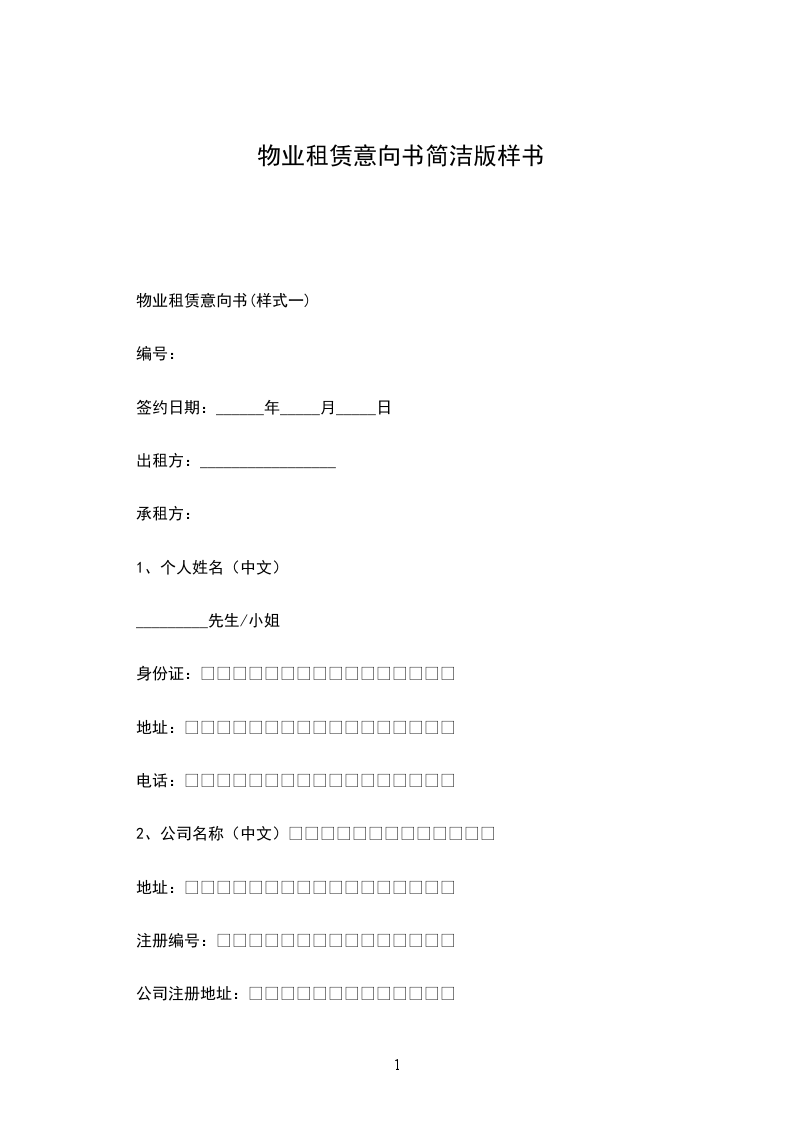 物业租赁意向书(样式一)