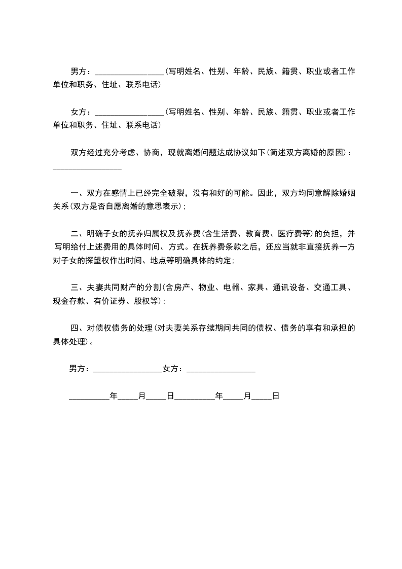 甲、乙双方于________________年____月____日在武汉市__________区民政局登记结婚,现因_____________,双方感情却已破裂,无法继续共同生活且没有和好可能,故双方向婚姻登记机关申请离婚。经双方充分协商后,就离婚、子女抚养、财产分割问题自愿达成协议如下:_________________
