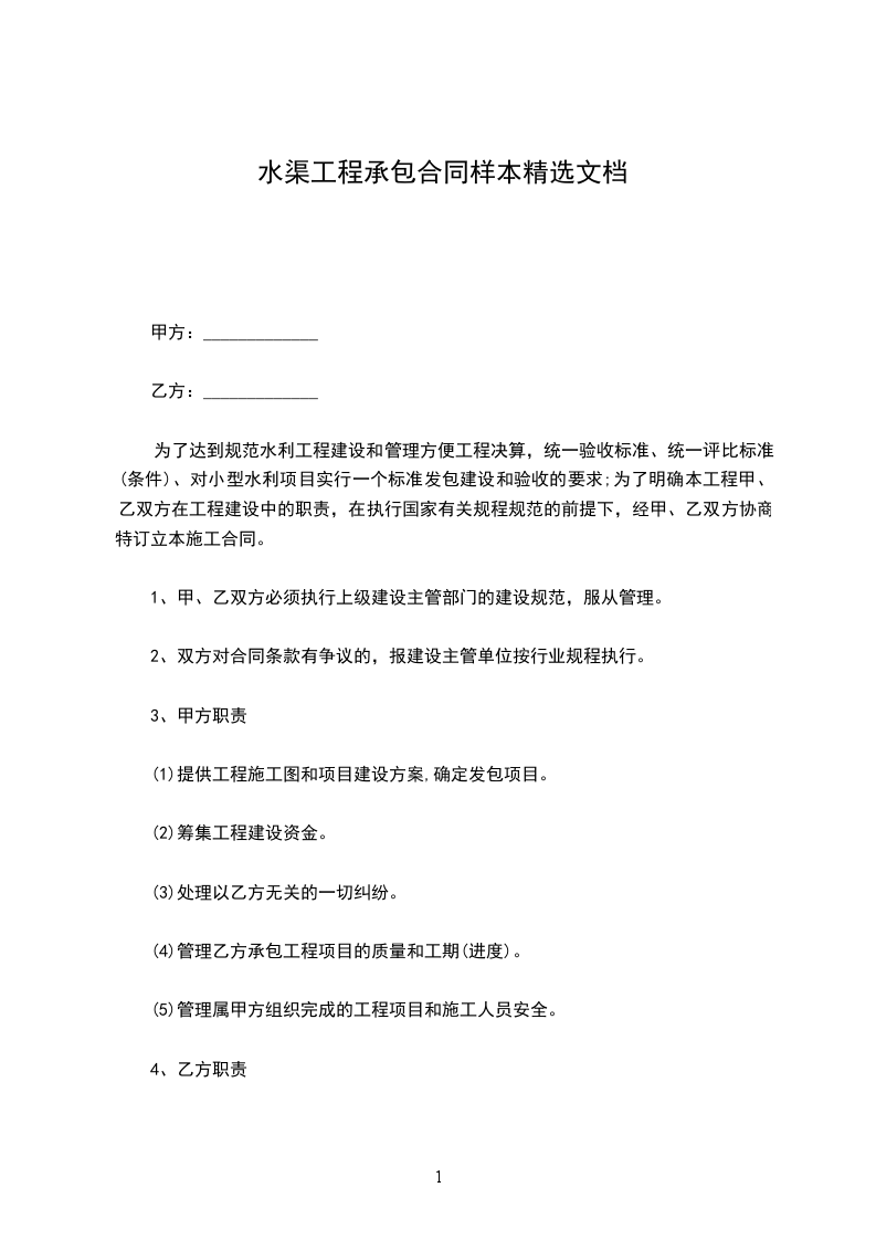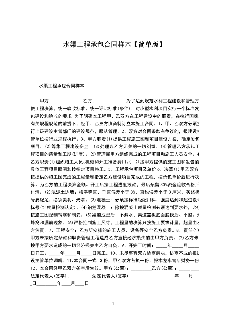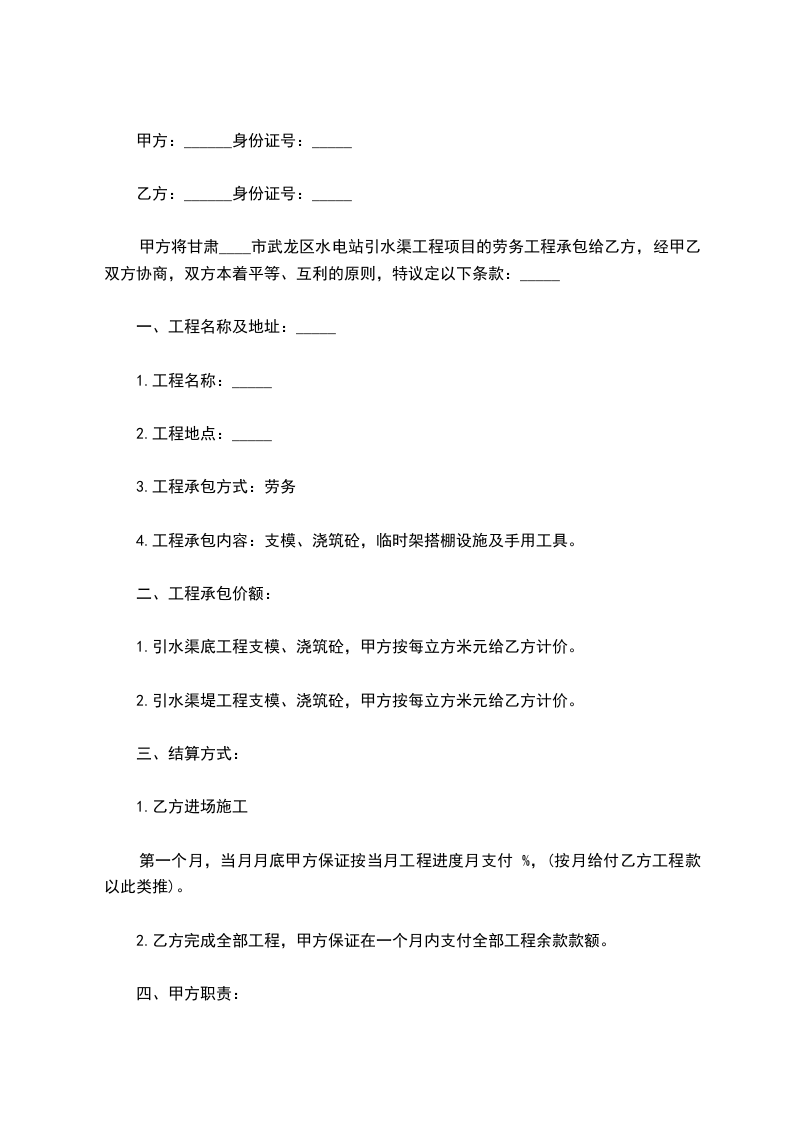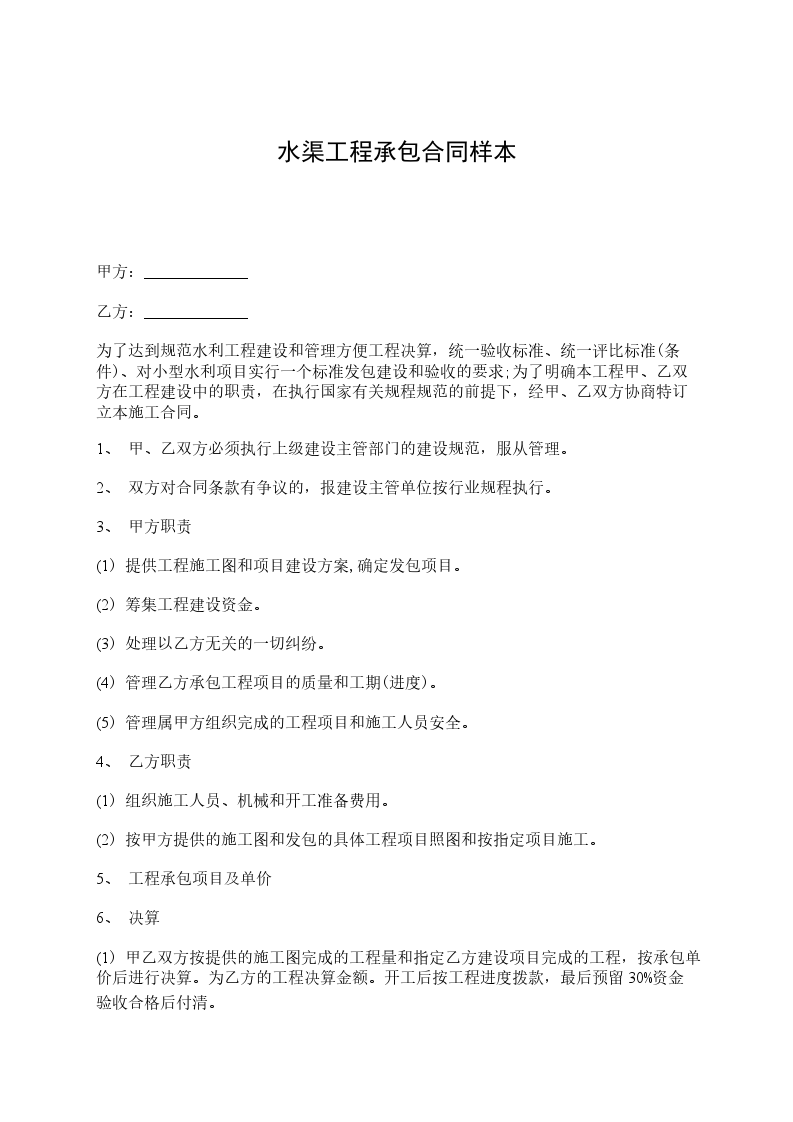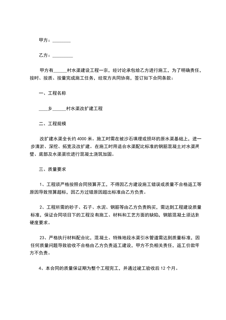甲方:_____________ 乙方:_____________ 为了达到规范水利工程建设和管理方便工程决算,统一验收标准、统一评比标准(条件)、对小型水利项目实行一个标准发包建设和验收的要求;为了明确本工程甲、乙双方在工程建设中的职责,在执行国家有关规程规范的前提下,经甲、乙双方协商特订立本施工合同。 1、 甲、乙双方必须执行上级建设主管部门的建设规范,服从管理。 2、 双方对合同条款有争议的,报建设主管单位按行业规程执行。 3、 甲方职责 (1) 提供工程施工图和项目建设方案,确定发包项目。 (2) 筹集工程建设资金。 (3) 处理以乙方无关的一切纠纷。 (4) 管理乙方承包工程项目的质量和工期(进度)。 (5) 管理属甲方组织完成的工程项目和施工人员安全。 4、 乙方职责 (1) 组织施工人员、机械和开工准备费用。 (2) 按甲方提供的施工图和发包的具体工程项目照图和按指定项目施工。 5、 工程承包项目及单价 6、 决算 (1) 甲乙双方按提供的施工图完成的工程量和指定乙方建设项目完成的工程,按承包单价后进行决算。为乙方的工程决算金额。开工后按工程进度拨款,最后预留30%资金验收合格后付清。 (2) 混泥土边墙:横平竖直、垂直偏差小于3%,直线误差小于3厘米,灰浆标号要配足,必须美观、光滑。 (3) 混凝土:必须按标准级配用料,强度达到和超过设计标号(经质量检测认定)。 (4) 钢筋混凝土:除按混凝土质量检测必须达到要求外,必须按施工图配制钢筋和制安。 (5) 渠道成型后:不漏水、渠道盖板底面脱模后、平整、无蜂窝和漏筋现象。 (6) 严格控制施工尺寸,工程量的决算只按施工要求计量,超量由乙方负责。 7、 工程安全:乙方所安排的施工人员、设备等安全乙 方负责。 8、 责任 (1) 甲方未按所定条款和职责管理工程造成乙方直接经济损失的由甲方负责。 (2) 乙方未按甲方要求造成的一切经济损失由乙方自负。 9、开完工时间:_____年_____月_____日开工。_____年_____月_____日完工。 10、未尽事宜双方协商解决,协商不成的报建设主管单位调解。 11、本合同一式3份,甲乙双方各执一份,报木龙水管所财务一份。 12、本合同经甲乙双方签字后生效。 甲方(公章):_________ 乙方(公章):_________ 法定代表人(签字):_________ 法定代表人(签字):_________ _________年____月____日 _________年____月____日
