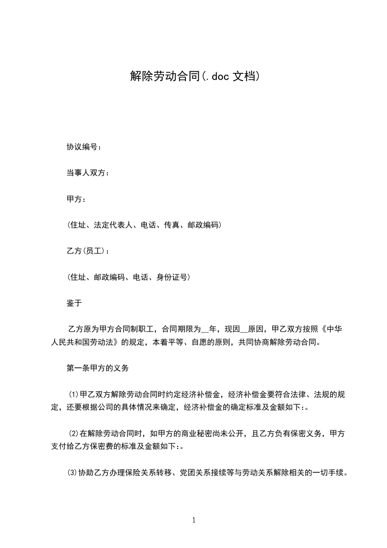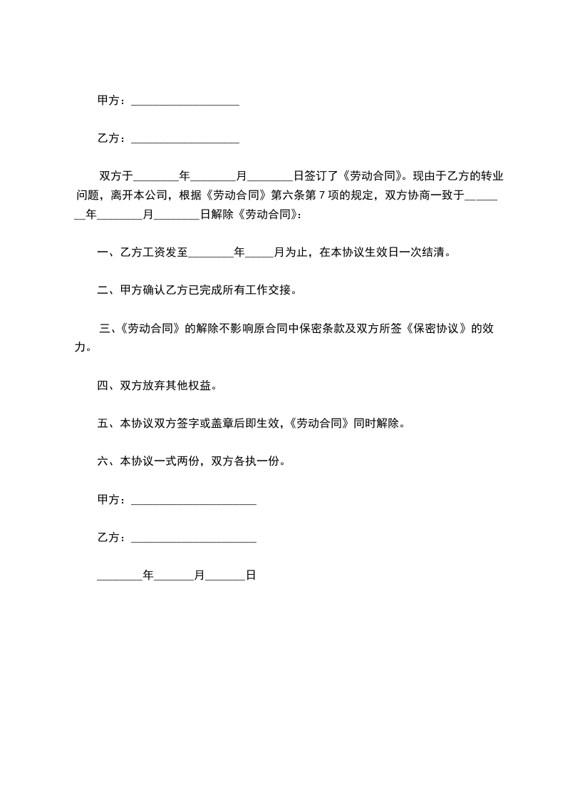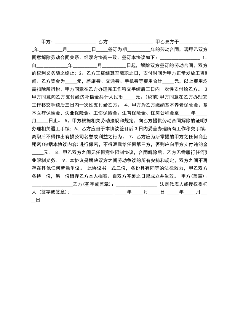 甲方:_________________ 乙方:_________________ 甲乙双方于_____________年__________月__________日_____签订为期__________年的劳动合同,现甲乙双方同意解除劳动合同关系。经双方协商一致,签订本协议如下:_________________ 1、自_____________年__________月__________日起,解除双方签订的劳动合同,双方的权利义务随之终止; 2、乙方工资结算至离职之日,支付时间为甲方正常发放工资时间。乙方奖金为_____元,差旅费、交通费、手机费等费用合计_____元,以上费用均需扣除所得税,甲方同意在乙方办理完工作移交手续后三日内一次性支付给乙方。 3、甲方同意向乙方支付经济补偿金共计人民币_____元。(税前)甲方同意在乙方办理完工作移交手续后三日内一次性支付给乙方。 4、甲方为乙方缴纳基本养老保险金、基本医疗保险金、失业保险金、工伤保险金、生育保险金、住房公积金至_____年_____月_____日止。 5、甲方根据相关劳动法规和规定,向乙方提供劳动合同解除的证明并办理相关退工手续; 6、乙方应当于本协议签订后3日内妥善办理所有工作移交手续,离职后不得作出有损公司名誉或利益之行为。 7、乙方应为所掌握的甲方之任何商业秘密(包括本协议内容)进行保密,不得泄露给任何第三方,否则应向甲方支付违约金_____元。 8、甲乙双方之间无任何竞业限制协议,合同解除后,乙方无需履行任何竞业限制义务。 9、本协议是解决双方之间劳动争议的所有安排和规定,双方之间不再存在其他任何劳动争议。 此协议书一式三份,各份具有同等的法律效力,甲乙双方各持一份,另一份留存乙方本人档案。自双方签署之日起成立并生效。 甲方(盖章):_________________乙方(签字或盖章):_________________ 法定代表人或授权委托人 (签字或签章):_________________ _____年_____月_____日 _____年_____月_____日