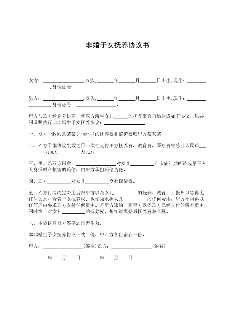 女方:_________________,汉族,_______年_______月_______日出生,现住:_________________,身份证号:_________________; 男方:_________________,汉族,_______年_______月_______日出生,现住:_________________,身份证号:_________________。 甲方与乙方经充分协商,就双方所生女儿______的抚养事宜自愿达成如下协议,以共同遵照执行此非婚生子女抚养协议:_________________ 一、双方一致同意某某(非婚生)的抚养权和监护权归甲方某某某, 二、乙方于本协议生效之日一次性支付甲方抚养费、教育费、医疗费等总计人民币__________万元(__________万元)。 三、甲、乙双方同意:_________________对女儿__________在未成年期间造成第三人人身或财产损害的赔偿,由甲方承担赔偿责任。 四、乙方__________对女儿__________享有探望权。 五、乙方付清约定费用后跟甲方以及女儿__________的抚养、教育、上报户口等再无任何关系,看着子女抚养权。也无须承担女儿__________的任何费用,甲方不得再以任何理由要求乙方支付任何费用。若甲方违约,则甲方返还乙方已经支付的所有费用,同时终止对女儿__________的抚养权。想知道离婚后抚养费怎么算。 六、本协议自双方签字之日起生效。 本非婚生子女抚养协议一式二份,甲乙方各自留存一份。 甲方:_________________(签名)乙方:_________________(签名) ________年____月____日________年____月____日