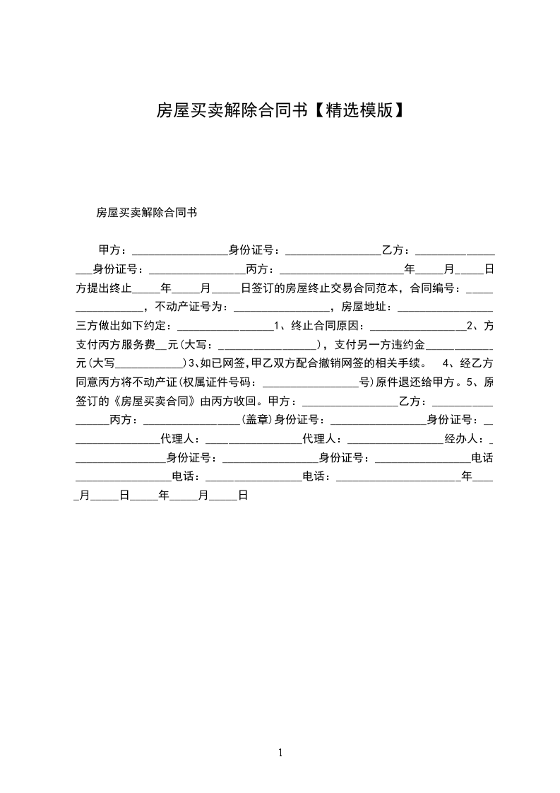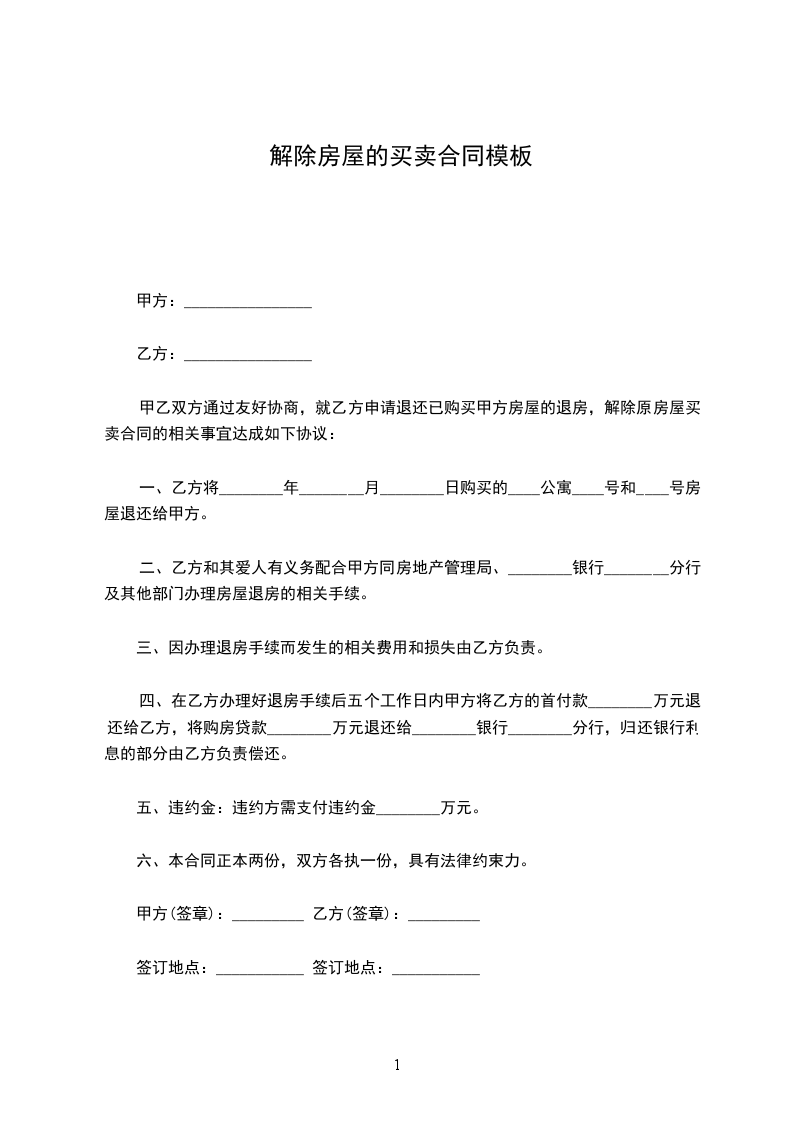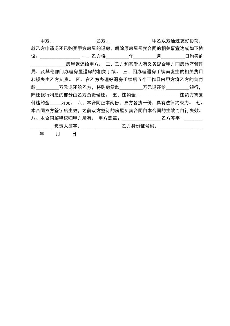 甲方:_________________ 乙方:_________________ 甲乙双方通过友好协商,就乙方申请退还已购买甲方房屋的退房,解除原房屋买卖合同的相关事宜达成如下协议:_________________ 一、乙方将__________年__________月__________日购买的_______________房屋退还给甲方。 二、乙方和其爱人有义务配合甲方同房地产管理局、及其他部门办理房屋退房的相关手续。 三、因办理退房手续而发生的相关费用和损失由乙方负责。 四、在乙方办理好退房手续后五个工作日内甲方将乙方的首付款__________万元退还给乙方,将购房贷款__________万元退还给__________银行,归还银行利息的部分由乙方负责偿还。 五、违约金:_________________违约方需支付违约金_____万元。 六、本合同正本两份,双方各执一份,具有法律约束力。 七、本合同双方签字后生效,之前双方签订的房屋买卖合同自本合同的生效而自行失效。 八、本合同解释权归甲方所有。 甲方盖章:_________________乙方签字:_________________ 负责人签字:_________________乙方身份证号码:_________________ _____年_____月_____日