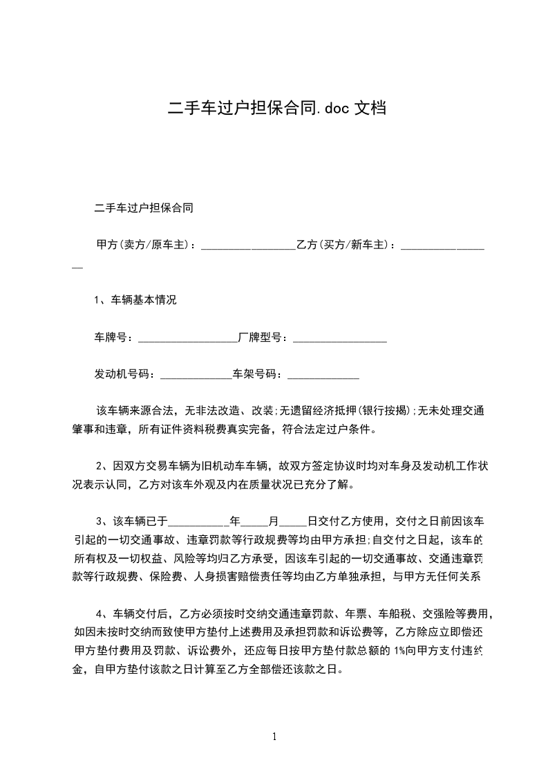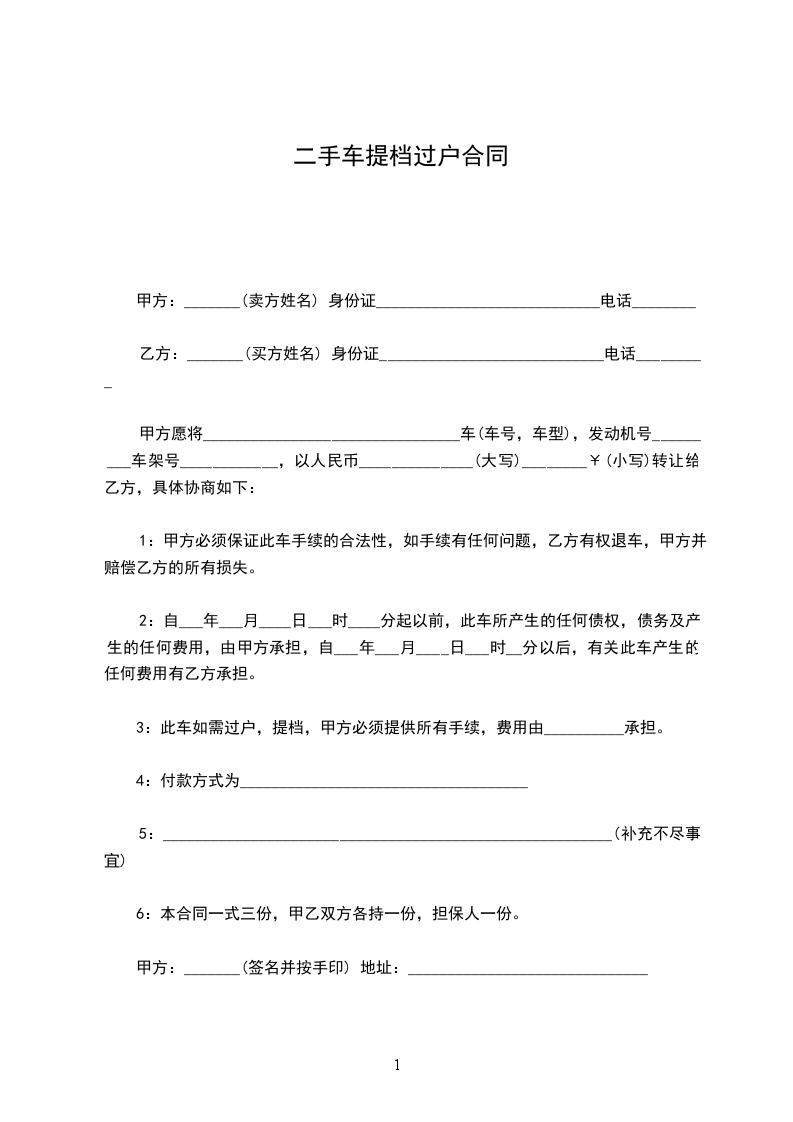 5、双方商定该机动车在_______________内必须办-理完结过户手续,过户费用由乙方承担。如未在规定时间内办结该车法定过户手续,乙方应每日按该车交易价格_______________的5‰向甲方支付违约金,直至乙方办结该车法定过户手续。