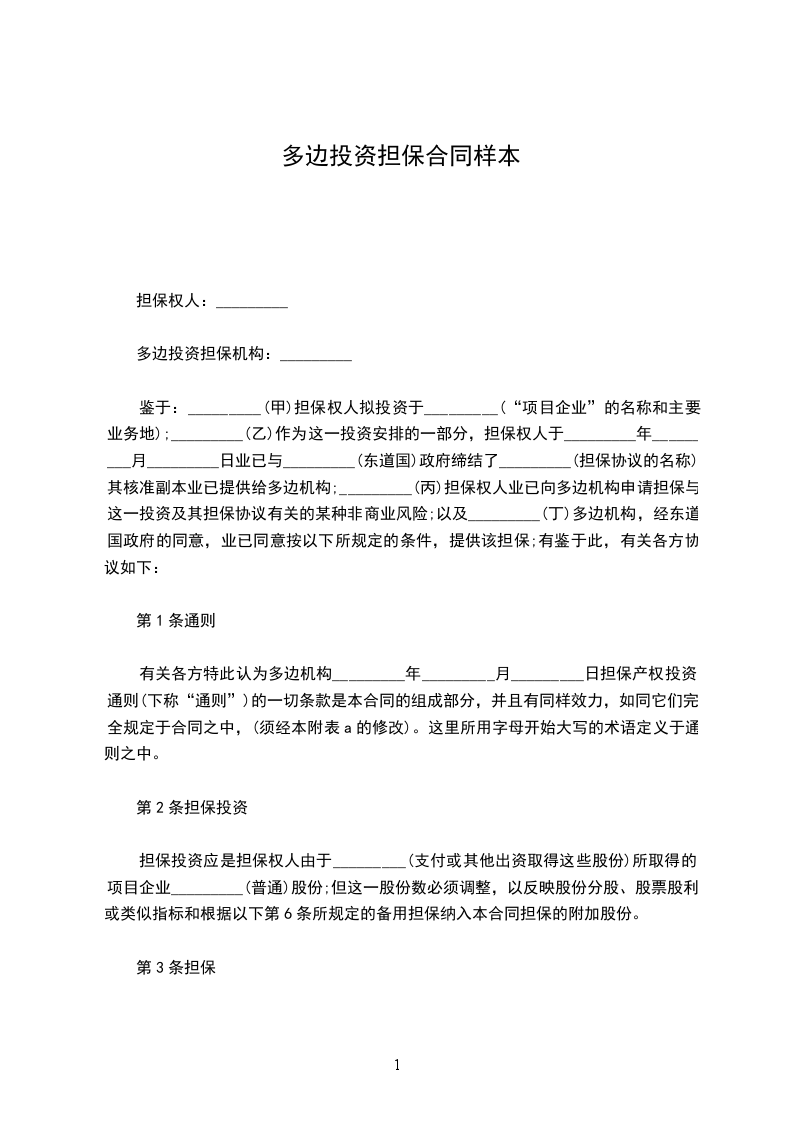 鉴于:_________(甲)担保权人拟投资于_________(“项目企业”的名称和主要业务地);_________(乙)作为这一投资安排的一部分,担保权人于_________年_________月_________日业已与_________(东道国)政府缔结了_________(担保协议的名称),其核准副本业已提供给多边机构;_________(丙)担保权人业已向多边机构申请担保与这一投资及其担保协议有关的某种非商业风险;以及_________(丁)多边机构,经东道国政府的同意,业已同意按以下所规定的条件,提供该担保;有鉴于此,有关各方协议如下: