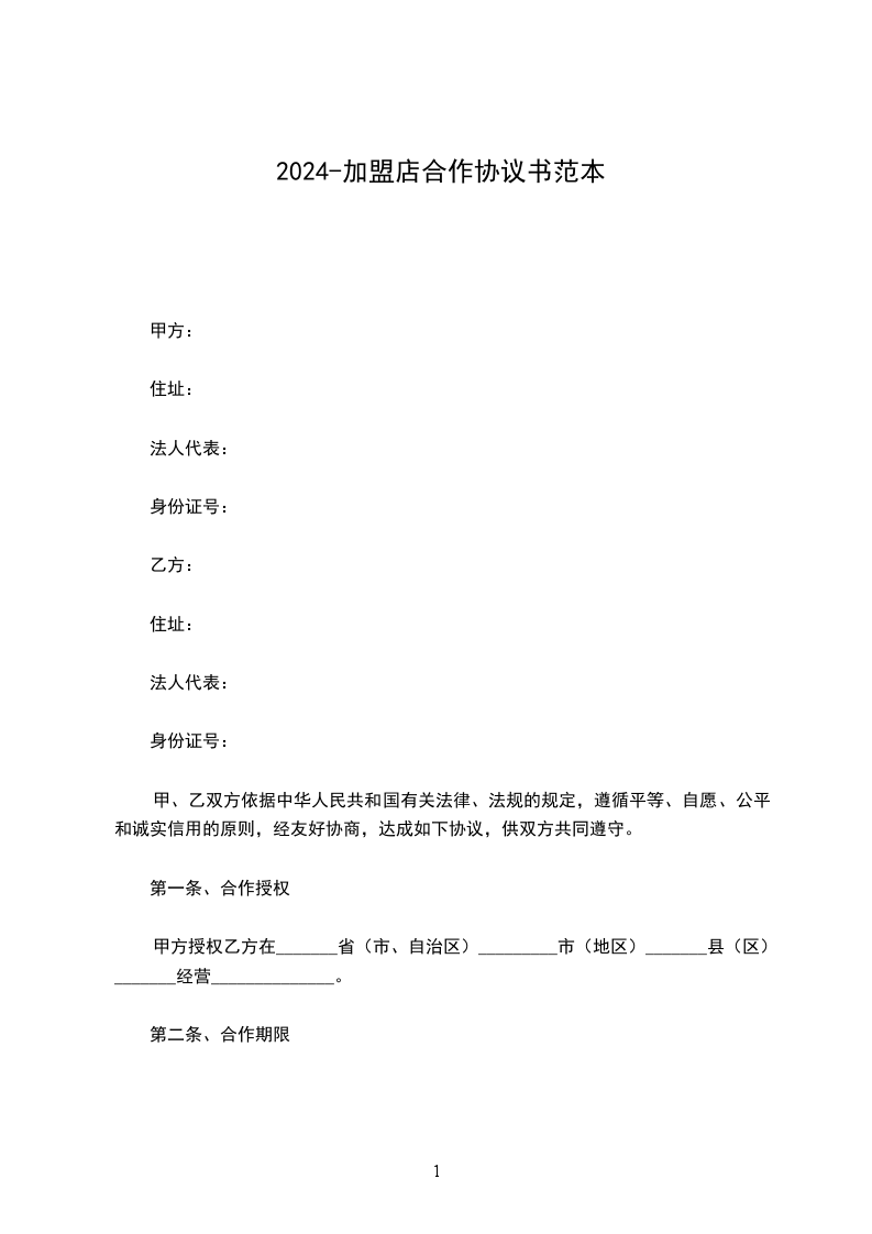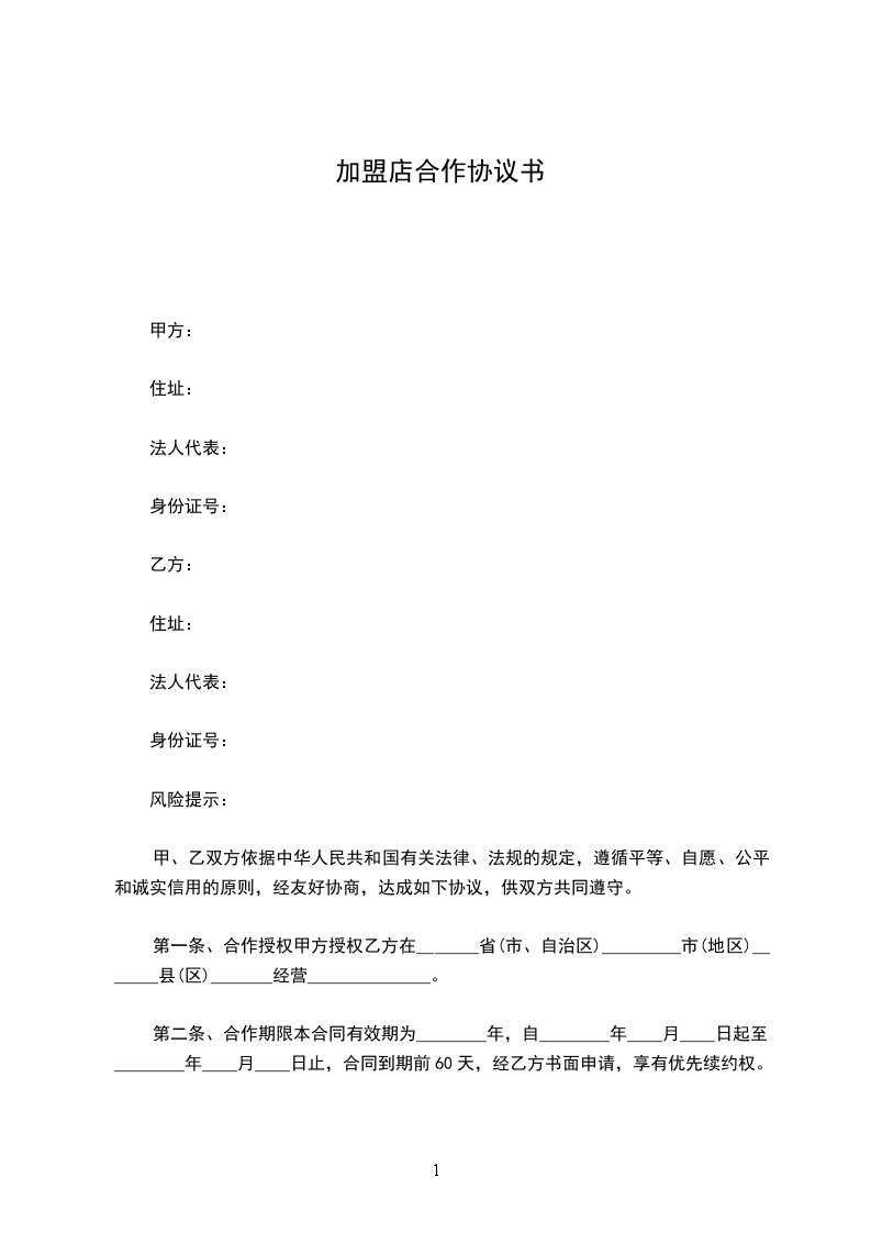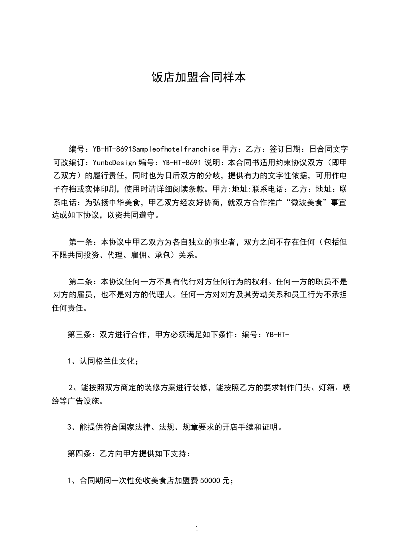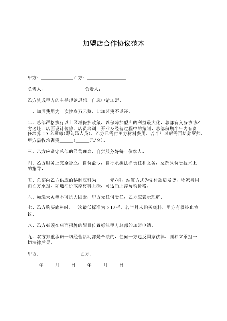 甲方:______________乙方:_________________ 负责人:_________________负责人:_________________ 乙方赞成甲方的主导理论思想,自愿申请加盟。 一、加盟费用为一次性叁万元整,此加盟费不返还。 二、总部严格执行以上区域保护政策,以保障加盟店的利益最大化。总部有义务协助乙方选址,店面设计装修,店员培训,开业及经营过程中的策划。总部前期半年内有责任培养2-3名厨师(即勾汤人员),乙方只需付甲方材料费用,若半年过后需再培养厨师,甲方需收培训费______(______元/名)。 三、乙方应遵守总部的经营理念,自觉服务好每一位客人。 四、乙方财务上完全独立,自负盈亏,自行承担法律责任和义务,总部只负责技术上的指导。 五、总部向乙方供应的秘制底料为______元/桶,结算方式为先付款后发货,物流费用由乙方承担,如遇油价或原材料上涨,可适当上浮每桶价格。 六、如遇天灾等不可抗力因素,甲方无任何责任,乙方应表示理解。 七、乙方购买底料时,一次最低标准为5-10桶,若半月未购买底料,甲方有权终止协议。 八、乙方必须在店面招牌的醒目位置标注甲方总部的加盟电话。 九、双方郑重承诺一切经营活动都是合法的,任何一方违反国家法律,则独立承担一切法律后果。 甲方:_________________乙方:_________________ _____年_____月_____日_____年_____月_____日