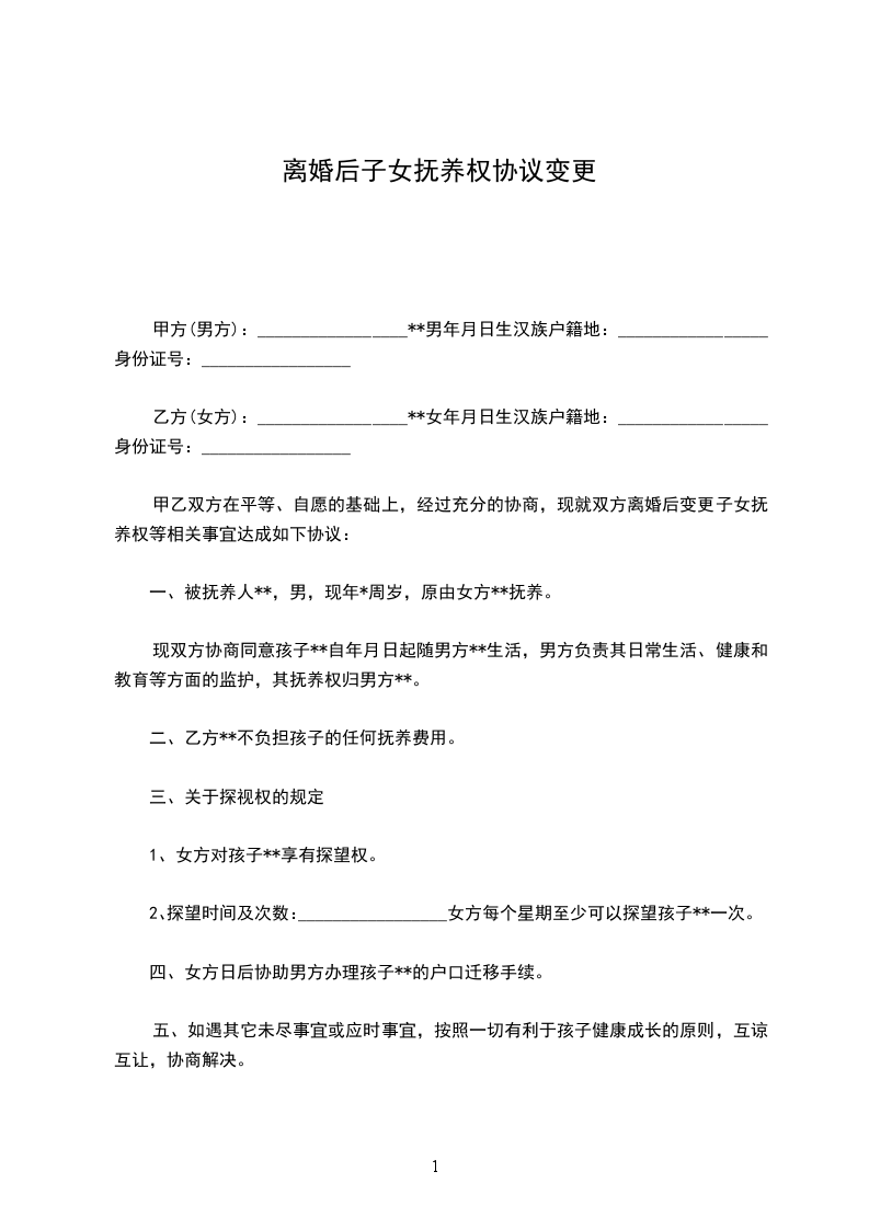 甲乙双方在平等、自愿的基础上,经过充分的协商,现就双方离婚后变更子女抚养权等相关事宜达成如下协议: