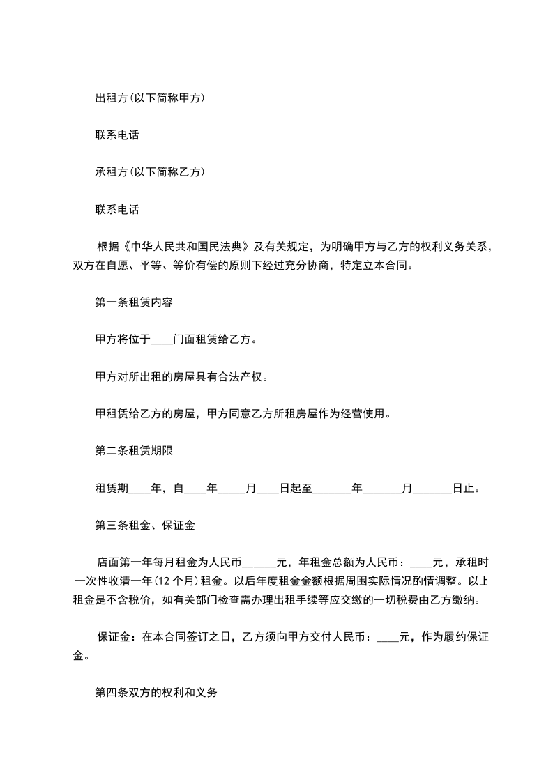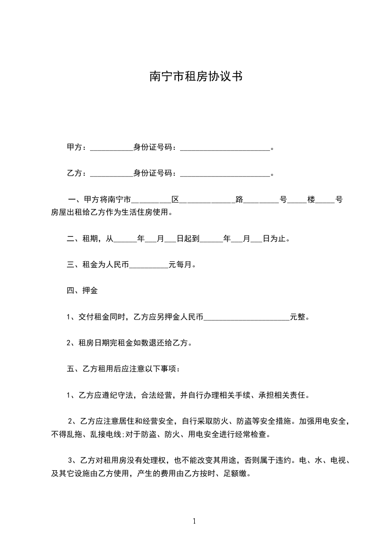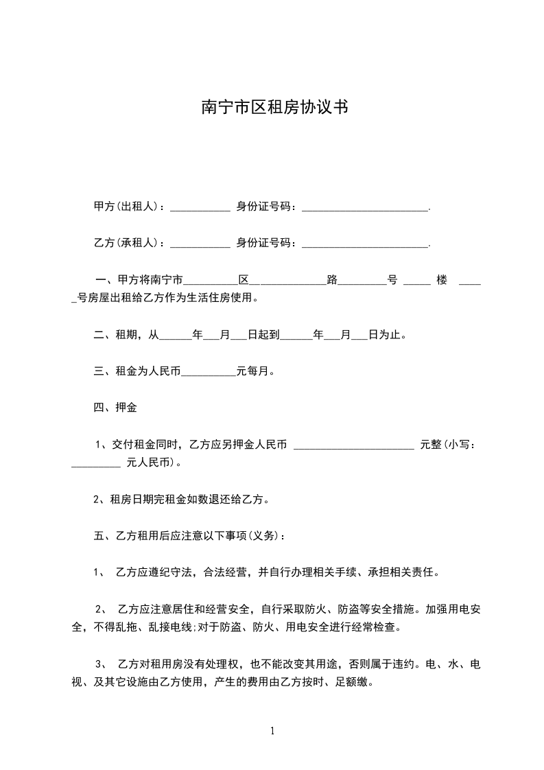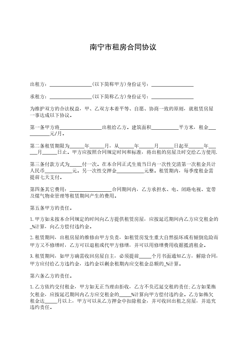 出租方:_________________(以下简称甲方)身份证号:_________________ 承租方:_________________(以下简称乙方)身份证号:_________________ 为维护双方的合法权益,甲、乙双方本着平等、自愿、协商一致的原则,就租赁房屋一事达成以下协议。 第一条甲方将_________________出租给乙方。建筑面积___________平方米,租金___________元/月。 第二条租赁期限为______年______月,从______年______月______日起至______年______月______日止。甲方应按照合同规定时间和标准,将出租的房屋及时交给乙方使用. 第三条付款方式为_____付一次。在本合同正式生效当日内一次性交清第一次租金共计人民币___________元。另一次性交押金___________元整。租赁期内,每季度租金需提前七天支付。 第四条其它费用:_________________合同期间内,乙方承担水、电、闭路电视、宽带及煤气物业管理等租赁期间产生的费用。 第五条甲方的责任。 1.甲方如未按本合同规定的时间向乙方提供租赁房屋,应按延迟期间内乙方应交租金的_%计算,向乙方偿付违约金。 2.租赁期间,出租房屋的维修由甲方负责,如租赁房发生重大自然损坏或有倾倒危险而甲方又不修缮时,乙方可以退租或代甲方修缮,并可以用修缮费用收据抵消租金。 3.租赁期间,如甲方确需收回房屋自主,必须提前_____个月书面通知乙方,解除合同,甲方应付给乙方违约金,违约金以剩余租期内应交租金总额的_%计算。 第六条乙方的责任。 1.乙方依约交付租金,甲方如无正当理由拒收,乙方不负迟延交租的责任;乙方如果拖欠租金,应按延迟期间内乙方应交租金的_____%计算向甲方偿付违约金。乙方如拖欠租金达_____月以上,甲方可以从乙方押金中扣除租金,并可收回出租之房屋,并追究违约责任。 3.租赁期间,如乙方确因特殊情况需要退房,必须提前_____个月书面通知甲方,解除合同,应付给甲方违约金,违约金以剩余租期内应交租金总额的_____%计算。 4.租赁期间,乙方不得擅自改变房屋的结构及用途,乙方如因故意或过失造成租用房屋和设备的毁损,应负责恢复原状或赔偿经济损失。乙方如需装修墙窗,须事先征得甲方同意。 5.租赁期满或合同解除,乙方必须按时搬出全部物件。搬迁后_日内房屋里如仍有余物,视为乙方放弃所有权,由甲方处理。 6.租赁期满或合同解除,如乙方逾期不搬迁,乙方应赔偿甲方因此所受的损失,必要时甲方可以向人民法院起诉和申请执行。 第七条合同期满,如甲方的租赁房屋需继续出租或出卖,乙方享有优先权。 第八条房屋如因不可抗力的自然灾害导致毁损,本合同则自然终止,互不承担责任。 第九条本合同如有未尽事宜,须经双方协商作出补充规定。补充规定与本合同具有同等效力。 第十条屋内设备:_________________空调挂机_____台,洗衣机_____台,彩电_____台,油烟机_____台,燃气灶_____台,电热水器_____台,冰箱_____台,微波炉_____台,写字桌_____,沙发_____,餐桌_____,椅_____,床_____,衣柜_____,电视柜_____,茶几_____,鞋柜_____等设施。 第十一条备注:_________________(合同期满归还,遗失照价赔偿) 煤气卡_____张门卡_____张钥匙_____把 本合同执行中如发生纠纷,应通过甲乙双方协商解决。协商不成,可提请当地房管部门调解或人民法院裁决。 本合同一式二份,甲、乙双方各执一份,签字生效。 出租人:_________________联系电话:_________________ 承租人:_________________联系电话:_________________