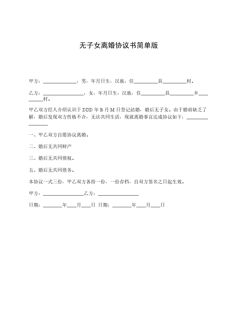 甲方:______________,男,______年____月____日生,汉族,住__________县__________村。 乙方:_________________,女,______年____月____日生,汉族,住__________县__________乡__________村。 甲乙双方经人介绍认识于DDD年B月M日登记结婚,婚后无子女。由于婚前缺乏了解,婚后发现双方性格不合,无法共同生活,现就离婚事宜达成协议如下:_________________ 一、甲乙双方自愿协议离婚。 二、婚后无共同财产 三、婚后无共同债权。 五、婚后无共同债务。 本协议一式三份,甲乙双方各持一份,一份存档,自双方签名之日起生效。 甲方:_________________乙方:_________________ 日期:________年____月____日 日期:________年____月____日