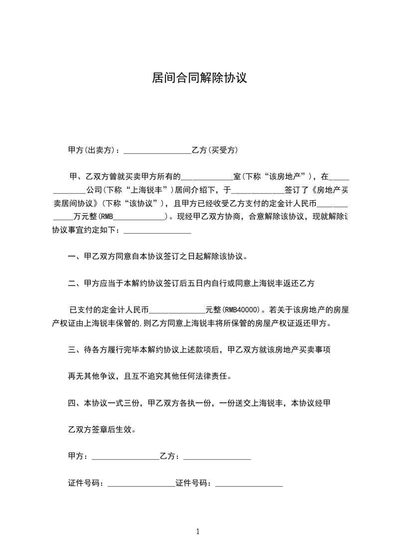 甲、乙双方曾就买卖甲方所有的_____________室(下称“该房地产”),在_____________公司(下称“上海锐丰”)居间介绍下,于_____________签订了《房地产买卖居间协议》(下称“该协议”),且甲方已经收受乙方支付的定金计人民币_____________万元整(RMB_____________)。现经甲乙双方协商,合意解除该协议,现就解除该协议事宜约定如下:_________________