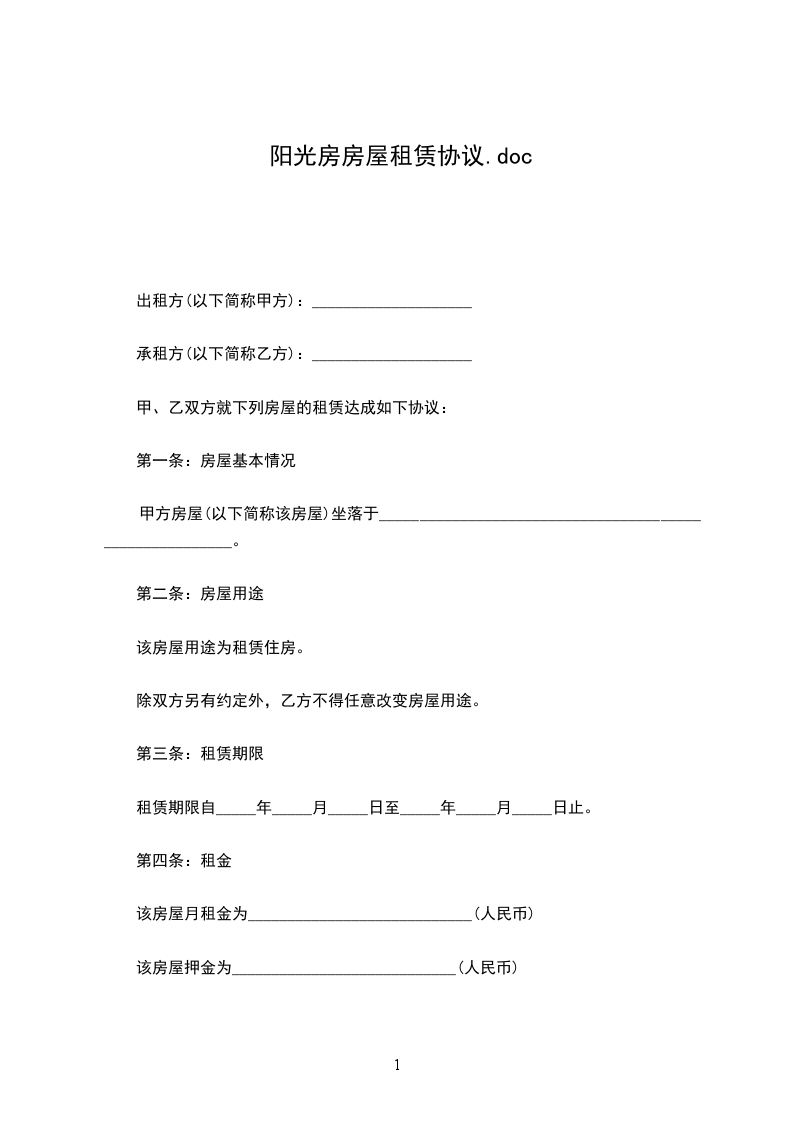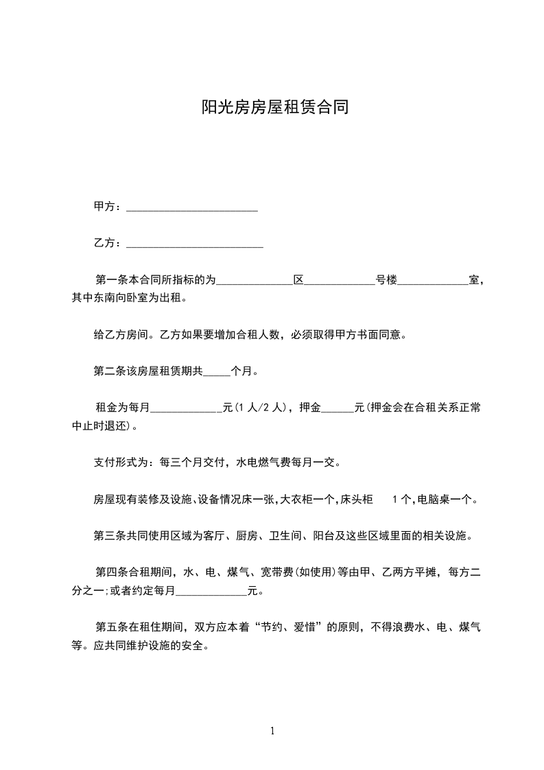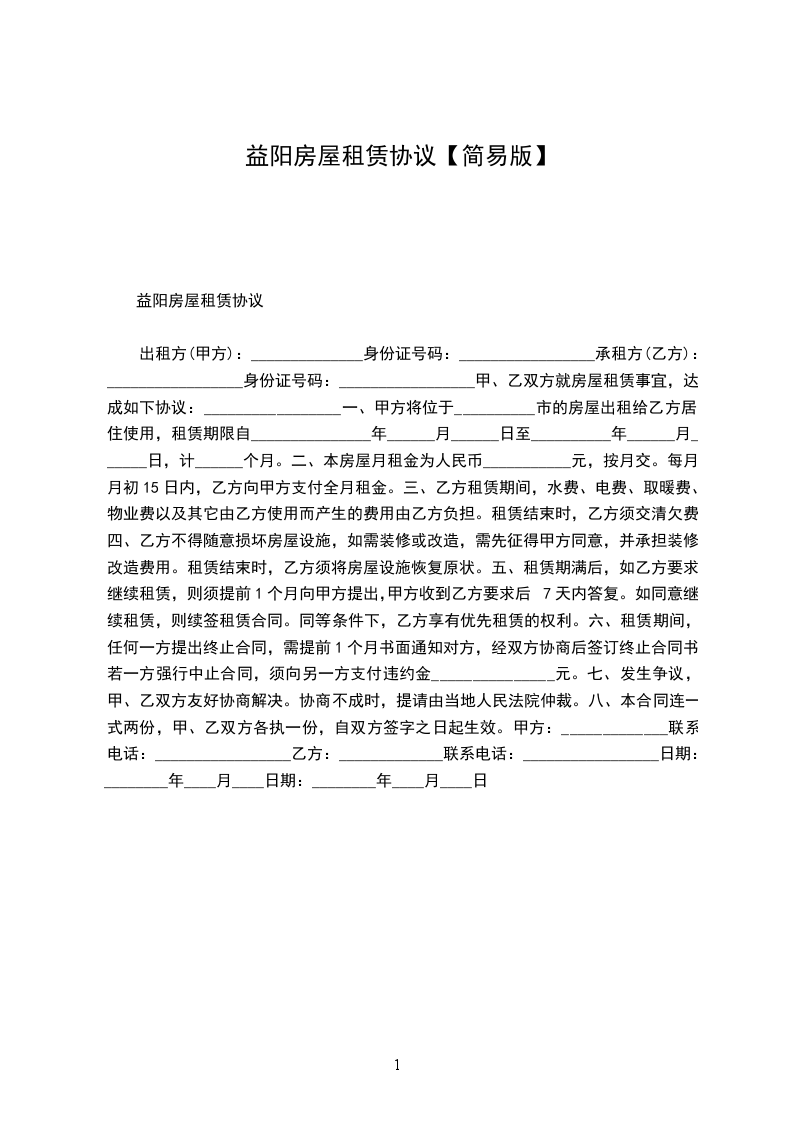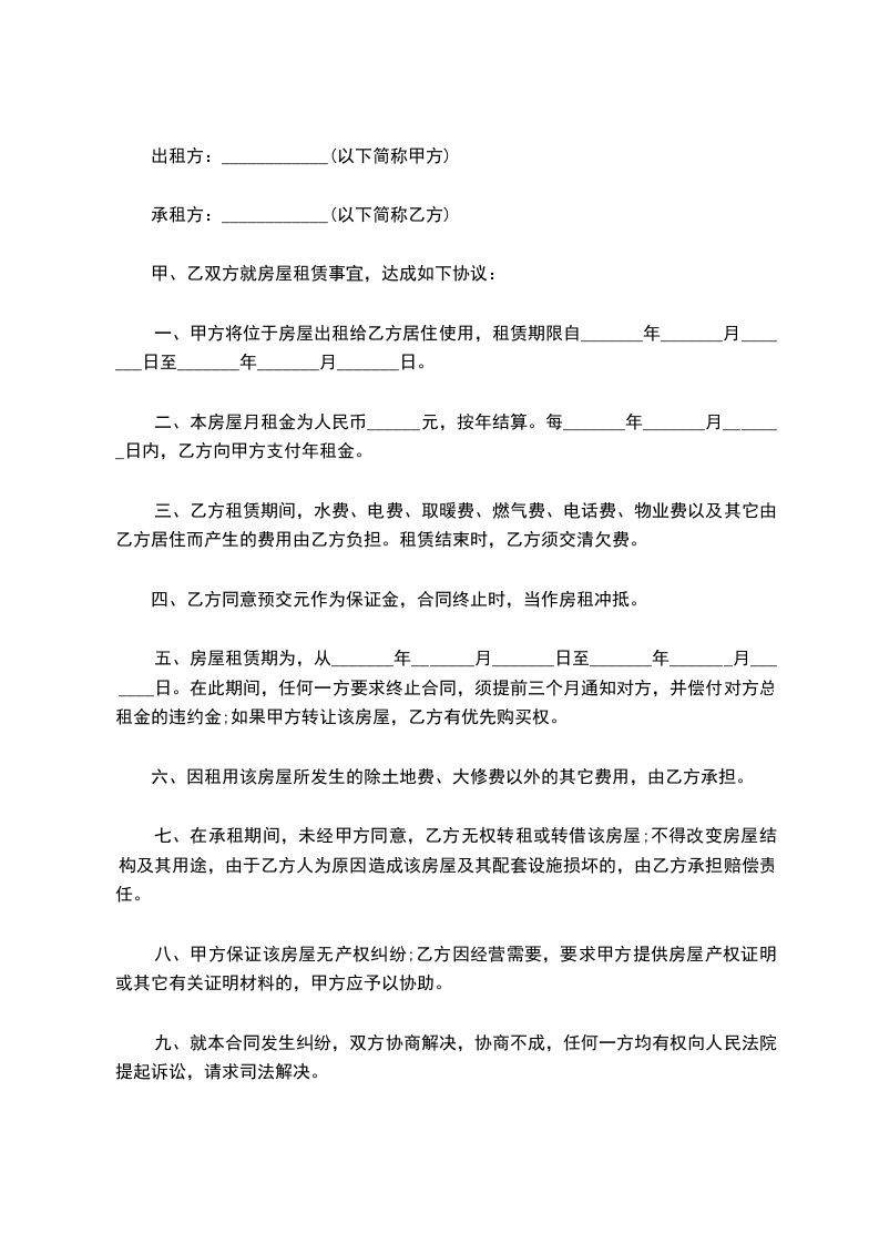 出租方(甲方):______________身份证号码:_________________ 承租方(乙方):_________________身份证号码:_________________ 甲、乙双方就房屋租赁事宜,达成如下协议:_________________ 一、甲方将位于__________市的房屋出租给乙方居住使用,租赁期限自_______________年______月______日至__________年______月______日,计______个月。 二、本房屋月租金为人民币___________元,按月交。每月月初15日内,乙方向甲方支付全月租金。 三、乙方租赁期间,水费、电费、取暖费、物业费以及其它由乙方使用而产生的费用由乙方负担。租赁结束时,乙方须交清欠费。 四、乙方不得随意损坏房屋设施,如需装修或改造,需先征得甲方同意,并承担装修改造费用。租赁结束时,乙方须将房屋设施恢复原状。 五、租赁期满后,如乙方要求继续租赁,则须提前1个月向甲方提出,甲方收到乙方要求后7天内答复。如同意继续租赁,则续签租赁合同。同等条件下,乙方享有优先租赁的权利。 六、租赁期间,任何一方提出终止合同,需提前1个月书面通知对方,经双方协商后签订终止合同书。若一方强行中止合同,须向另一方支付违约金_______________元。 七、发生争议,甲、乙双方友好协商解决。协商不成时,提请由当地人民法院仲裁。 八、本合同连一式两份,甲、乙双方各执一份,自双方签字之日起生效。 甲方:_____________联系电话:_________________ 乙方:_____________联系电话:_________________ 日期:________年____月____日 日期:________年____月____日