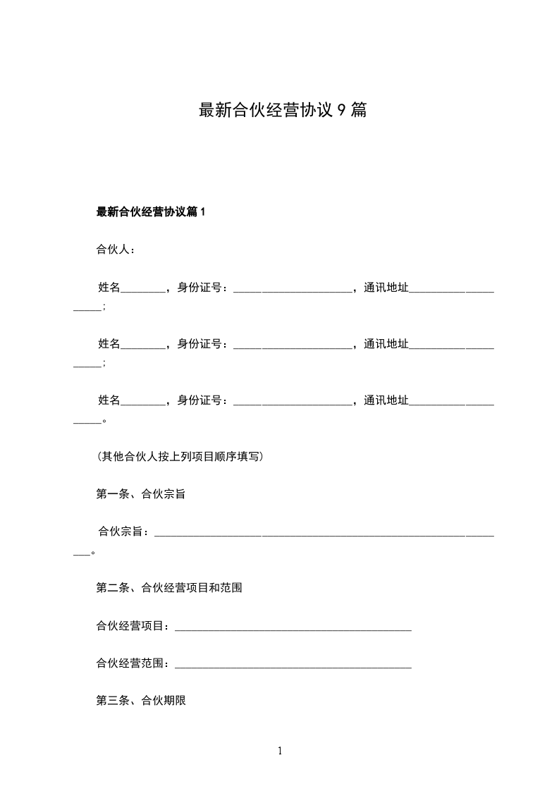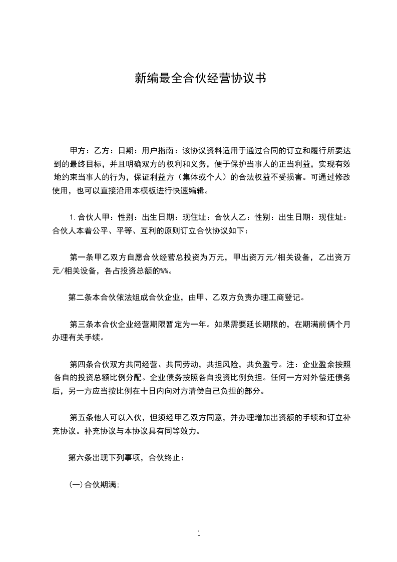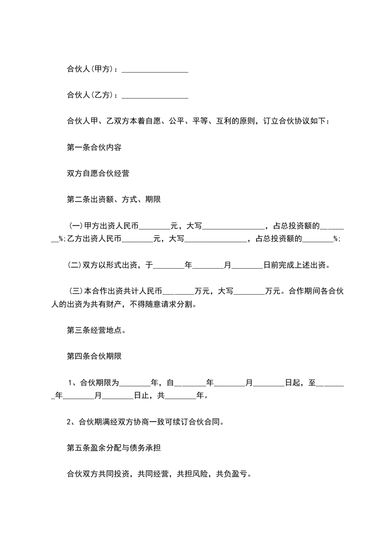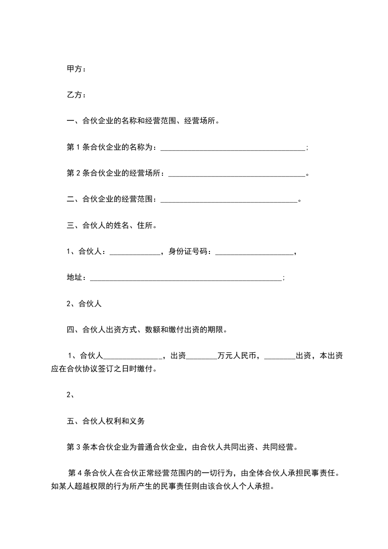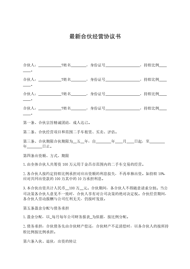 合伙人:____________?姓名________,身份证号__________________,持股比例________。 合伙人:____________?姓名________,身份证号__________________,持股比例________。 合伙人:____________?姓名________,身份证号__________________,持股比例________。 合伙人:____________?姓名________,身份证号__________________,持股比例________。 第一条、合伙宗旨精诚团结,成人达己。 第二条、合伙经营项目和范围二手车租赁、买卖、评估。 第三条、合伙期限合伙期限为__五__年,自________年____月____日起,至________年________日止。 第四条出资额、方式、期限 1.由全体合伙人共筹资100万元用于金昌市范围内的二手车交易的经营。 2.各合伙人按约定持股比例承担对应出资额的利息损失,不再单独出资。如持股10%,应对共同出资款的100万其中的10万承担利息。 3.本合伙出资共计人民币__100万__元。合伙期间,各合伙人不得随意请求分割。当公司决策各合伙人意见不一致时,合伙人享有对公司决策的绝对决定权。合伙经营期间,各合伙人劳动报酬与公司红利无关,仍按时发放。 第五条盈余分配与债务承担 1.盈余分配,以_每月每年公司财务报表_为依据,按比例分配。 2.债务承担:合伙债务先由合伙财产偿还,合伙财产不足清偿时,以各合伙人的按所持股比例按比例承担。 第六条入伙、退伙,出资的转让 1.入伙:①需承认本合同;②需经全体合伙人同意;③执行合同规定的权利义务。 2.退伙:①需有正当理由方可退伙;②不得在合伙不利时退伙;③退伙需提前________月告知其他合伙人并经全体合伙人同意;④退伙后以退伙时的财产状况进行结算,不论何种方式出资,均以金钱结算;⑤未经合同人同意而自行退伙给合伙造成损失的,应进行赔偿。? 3.出资的转让:在合伙经营期间,任一合伙人不得擅自转让自己的股份,否则视为退伙,并不予补偿。? 第七条?合伙负责人及其他合伙人的权利? 1.____________为合伙负责人。其权限是:①对外开展业务,订立合同;②对合伙事业进行日常管理;③购买和出售二手车;④支付合伙债务;⑤其他事宜。? 2.其他合伙人的权利:①参予合伙事业的管理;②听取合伙负责人开展业务情况的报告;④共同决定合伙重大事项。? 3、合伙人_________________的职责:? 4、合伙人_________________的职责:? 5、合伙人_________________的职责:? 6、合伙人_________________的职责:? 第八条?禁止行为? 1.未经全体合伙人同意,禁止任何合伙人私自以合伙名义进行业务活动;如其业务获得利益归合伙,造成损失按实际损失赔偿。 2.禁止合伙人经营与合伙竞争的业务。? 3.禁止合伙人再加入其他合伙。? 4.禁止合伙人与本合伙签订合同。? 5.如合伙人违反上述各条,应按合伙实际损失赔偿。劝阻不听者可由全体合伙人决定除名。? 第九条?合伙的终止及终止后的事项? 1.合伙因以下事由之一得终止:①合伙期届满;②全体合伙人同意终止合伙关系;③合伙事业完成或不能完成;④合伙事业违反法律被撤销;⑤法院根据有关当事人请求判决解散。? 2.合伙终止后的事项:①即行推举清算人,并邀请____________中间人(或公证员)参与清算;②清算后如有盈余,则按收取债权、清偿债务、返还出资、按比例分配剩余财产的顺序进行。固定资产和不可分物,可作价卖给合伙人或第三人,其价款参与分配;③清算后如有亏损,不论合伙人出资多少,先以合伙共同财产偿还,合伙财产不足清偿的部分,由合伙人按出资比例承担。? 第十条?纠纷的解决?合伙人之间如发生纠纷,应共同协商,本着有利于合伙事业发展的原则予以解决。如协商不成,可以诉诸法院。? 第十一条?本合同自订立并报经工商行政管理机关批准之日起生效并开始营业。 第十二条?本合同如有未尽事宜,应由合伙人集体讨论补充或修改。补充和修改的内容与本合同具有同等效力。? 第十三条?其他? 第十四条?本合同正本一式____份,合伙人各执一份,送____各存一份。??? 合伙人:____________?合伙人:____________?____年____月____日