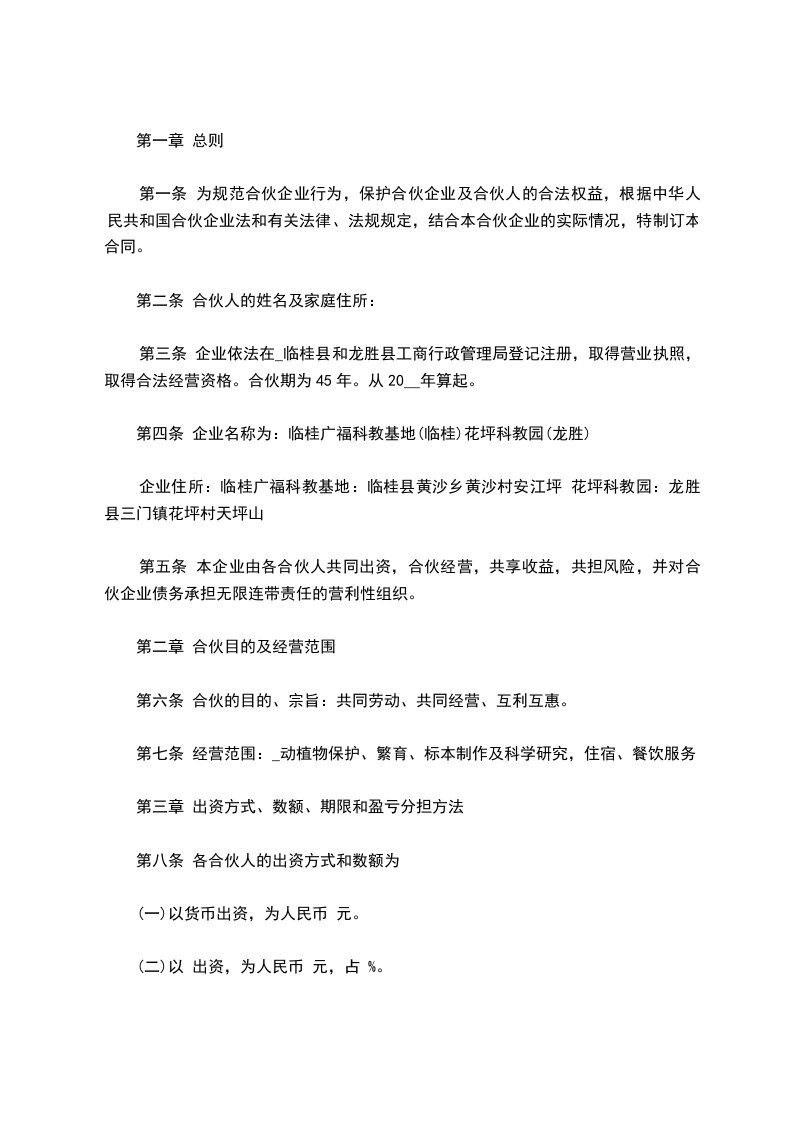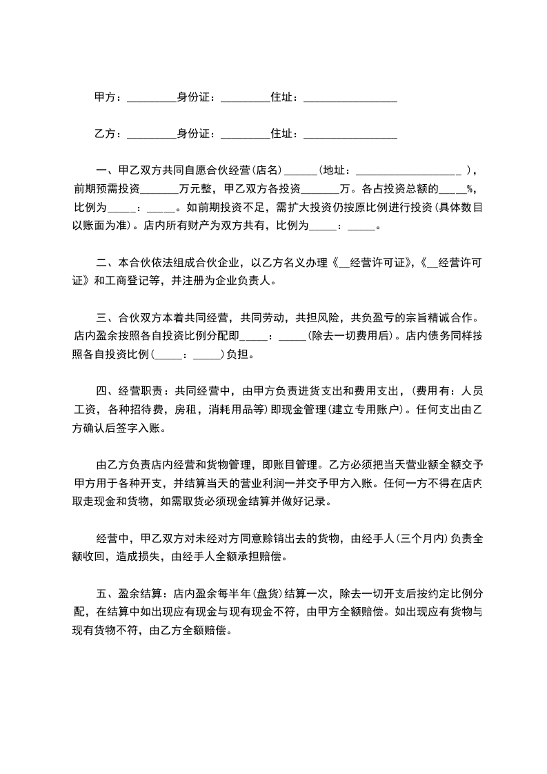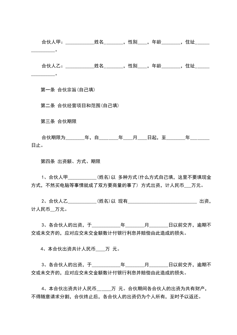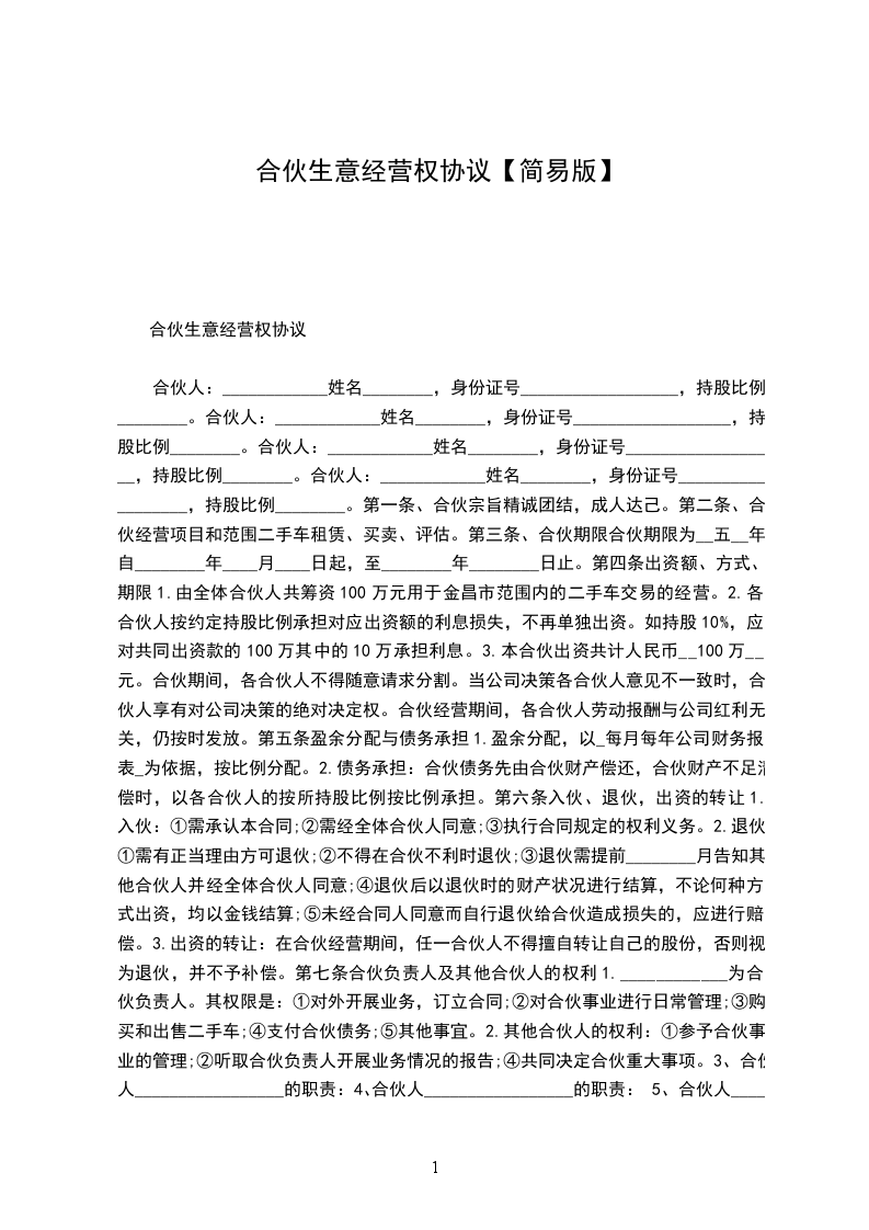 合伙人:____________?姓名________,身份证号__________________,持股比例________。 合伙人:____________?姓名________,身份证号__________________,持股比例________。 合伙人:____________?姓名________,身份证号__________________,持股比例________。 合伙人:____________?姓名________,身份证号__________________,持股比例________。 第一条、合伙宗旨精诚团结,成人达己。 第二条、合伙经营项目和范围二手车租赁、买卖、评估。 第三条、合伙期限合伙期限为__五__年,自________年____月____日起,至________年________日止。 第四条出资额、方式、期限 1.由全体合伙人共筹资100万元用于金昌市范围内的二手车交易的经营。 2.各合伙人按约定持股比例承担对应出资额的利息损失,不再单独出资。如持股10%,应对共同出资款的100万其中的10万承担利息。 3.本合伙出资共计人民币__100万__元。合伙期间,各合伙人不得随意请求分割。当公司决策各合伙人意见不一致时,合伙人享有对公司决策的绝对决定权。合伙经营期间,各合伙人劳动报酬与公司红利无关,仍按时发放。 第五条盈余分配与债务承担 1.盈余分配,以_每月每年公司财务报表_为依据,按比例分配。 2.债务承担:合伙债务先由合伙财产偿还,合伙财产不足清偿时,以各合伙人的按所持股比例按比例承担。 第六条入伙、退伙,出资的转让 1.入伙:①需承认本合同;②需经全体合伙人同意;③执行合同规定的权利义务。 2.退伙:①需有正当理由方可退伙;②不得在合伙不利时退伙;③退伙需提前________月告知其他合伙人并经全体合伙人同意;④退伙后以退伙时的财产状况进行结算,不论何种方式出资,均以金钱结算;⑤未经合同人同意而自行退伙给合伙造成损失的,应进行赔偿。? 3.出资的转让:在合伙经营期间,任一合伙人不得擅自转让自己的股份,否则视为退伙,并不予补偿。? 第七条?合伙负责人及其他合伙人的权利? 1.____________为合伙负责人。其权限是:①对外开展业务,订立合同;②对合伙事业进行日常管理;③购买和出售二手车;④支付合伙债务;⑤其他事宜。? 2.其他合伙人的权利:①参予合伙事业的管理;②听取合伙负责人开展业务情况的报告;④共同决定合伙重大事项。? 3、合伙人_________________的职责:? 4、合伙人_________________的职责:? 5、合伙人_________________的职责:? 6、合伙人_________________的职责:? 第八条?禁止行为? 1.未经全体合伙人同意,禁止任何合伙人私自以合伙名义进行业务活动;如其业务获得利益归合伙,造成损失按实际损失赔偿。 2.禁止合伙人经营与合伙竞争的业务。? 3.禁止合伙人再加入其他合伙。? 4.禁止合伙人与本合伙签订合同。? 5.如合伙人违反上述各条,应按合伙实际损失赔偿。劝阻不听者可由全体合伙人决定除名。? 第九条?合伙的终止及终止后的事项? 1.合伙因以下事由之一得终止:①合伙期届满;②全体合伙人同意终止合伙关系;③合伙事业完成或不能完成;④合伙事业违反法律被撤销;⑤法院根据有关当事人请求判决解散。? 2.合伙终止后的事项:①即行推举清算人,并邀请____________中间人(或公证员)参与清算;②清算后如有盈余,则按收取债权、清偿债务、返还出资、按比例分配剩余财产的顺序进行。固定资产和不可分物,可作价卖给合伙人或第三人,其价款参与分配;③清算后如有亏损,不论合伙人出资多少,先以合伙共同财产偿还,合伙财产不足清偿的部分,由合伙人按出资比例承担。? 第十条?纠纷的解决?合伙人之间如发生纠纷,应共同协商,本着有利于合伙事业发展的原则予以解决。如协商不成,可以诉诸法院。? 第十一条?本合同自订立并报经工商行政管理机关批准之日起生效并开始营业。 第十二条?本合同如有未尽事宜,应由合伙人集体讨论补充或修改。补充和修改的内容与本合同具有同等效力。? 第十三条?其他? 第十四条?本合同正本一式____份,合伙人各执一份,送____各存一份。??? 合伙人:____________?合伙人:____________?____年____月____日