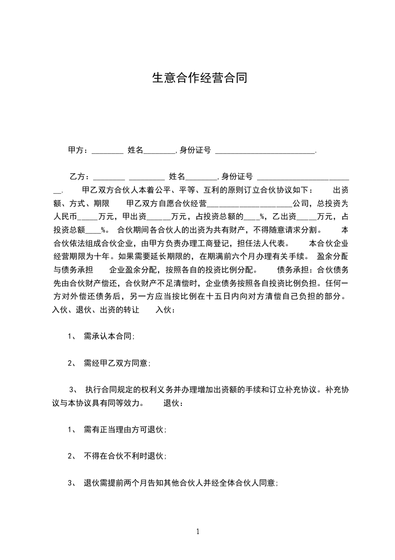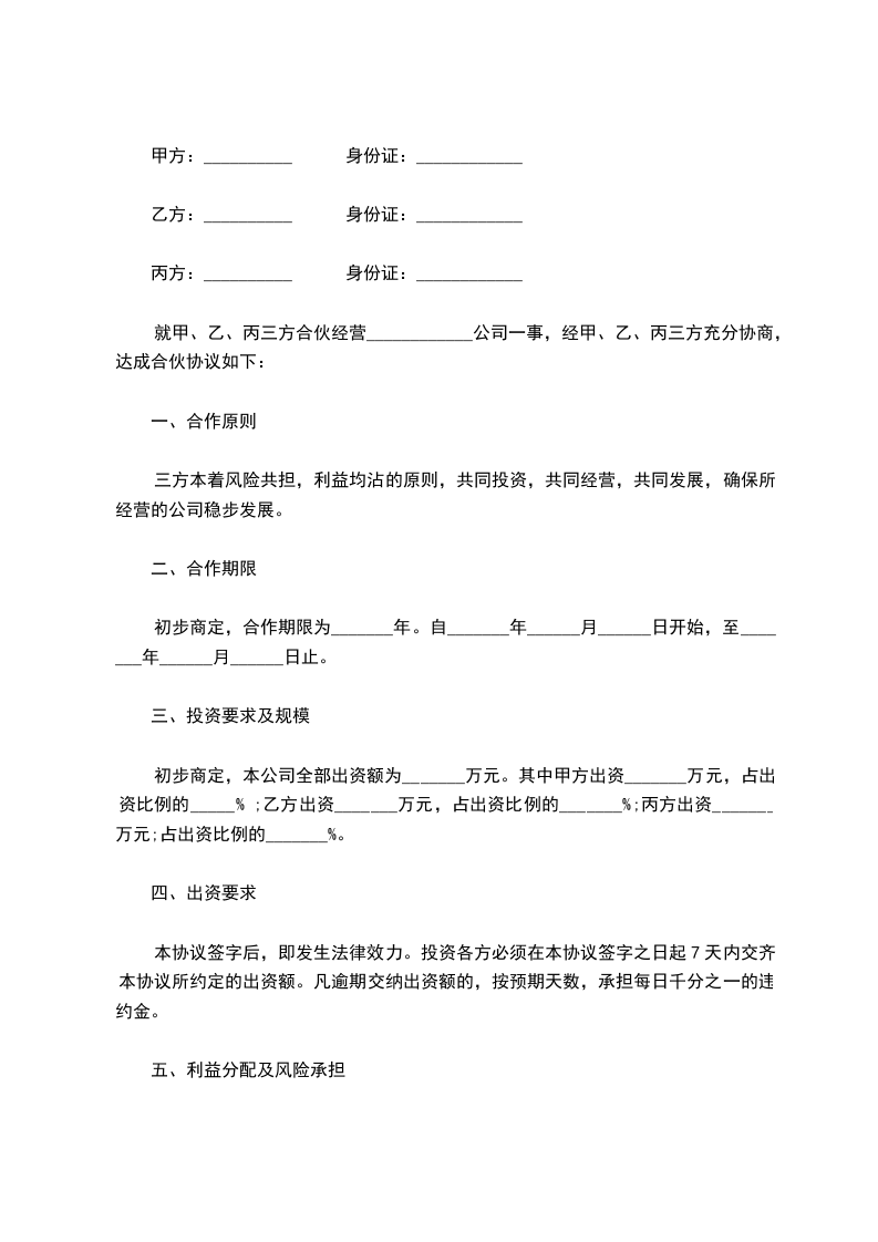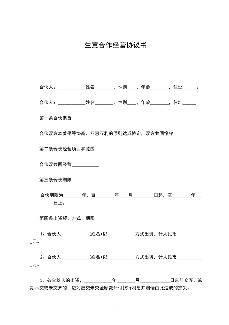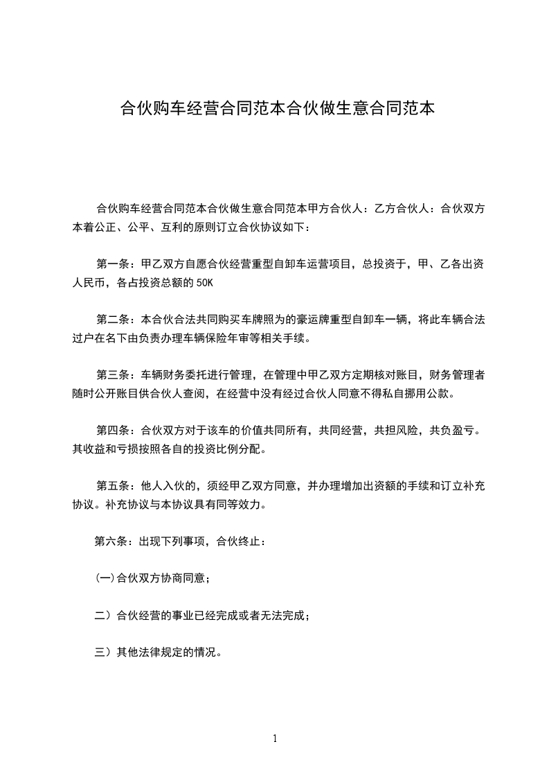 合伙人:____________?姓名________,身份证号__________________,持股比例________。 合伙人:____________?姓名________,身份证号__________________,持股比例________。 合伙人:____________?姓名________,身份证号__________________,持股比例________。 合伙人:____________?姓名________,身份证号__________________,持股比例________。 第一条、合伙宗旨精诚团结,成人达己。 第二条、合伙经营项目和范围二手车租赁、买卖、评估。 第三条、合伙期限合伙期限为__五__年,自________年____月____日起,至________年________日止。 第四条出资额、方式、期限 1.由全体合伙人共筹资100万元用于金昌市范围内的二手车交易的经营。 2.各合伙人按约定持股比例承担对应出资额的利息损失,不再单独出资。如持股10%,应对共同出资款的100万其中的10万承担利息。 3.本合伙出资共计人民币__100万__元。合伙期间,各合伙人不得随意请求分割。当公司决策各合伙人意见不一致时,合伙人享有对公司决策的绝对决定权。合伙经营期间,各合伙人劳动报酬与公司红利无关,仍按时发放。 第五条盈余分配与债务承担 1.盈余分配,以_每月每年公司财务报表_为依据,按比例分配。 2.债务承担:合伙债务先由合伙财产偿还,合伙财产不足清偿时,以各合伙人的按所持股比例按比例承担。 第六条入伙、退伙,出资的转让 1.入伙:①需承认本合同;②需经全体合伙人同意;③执行合同规定的权利义务。 2.退伙:①需有正当理由方可退伙;②不得在合伙不利时退伙;③退伙需提前________月告知其他合伙人并经全体合伙人同意;④退伙后以退伙时的财产状况进行结算,不论何种方式出资,均以金钱结算;⑤未经合同人同意而自行退伙给合伙造成损失的,应进行赔偿。? 3.出资的转让:在合伙经营期间,任一合伙人不得擅自转让自己的股份,否则视为退伙,并不予补偿。? 第七条?合伙负责人及其他合伙人的权利? 1.____________为合伙负责人。其权限是:①对外开展业务,订立合同;②对合伙事业进行日常管理;③购买和出售二手车;④支付合伙债务;⑤其他事宜。? 2.其他合伙人的权利:①参予合伙事业的管理;②听取合伙负责人开展业务情况的报告;④共同决定合伙重大事项。? 3、合伙人_________________的职责:? 4、合伙人_________________的职责:? 5、合伙人_________________的职责:? 6、合伙人_________________的职责:? 第八条?禁止行为? 1.未经全体合伙人同意,禁止任何合伙人私自以合伙名义进行业务活动;如其业务获得利益归合伙,造成损失按实际损失赔偿。 2.禁止合伙人经营与合伙竞争的业务。? 3.禁止合伙人再加入其他合伙。? 4.禁止合伙人与本合伙签订合同。? 5.如合伙人违反上述各条,应按合伙实际损失赔偿。劝阻不听者可由全体合伙人决定除名。? 第九条?合伙的终止及终止后的事项? 1.合伙因以下事由之一得终止:①合伙期届满;②全体合伙人同意终止合伙关系;③合伙事业完成或不能完成;④合伙事业违反法律被撤销;⑤法院根据有关当事人请求判决解散。? 2.合伙终止后的事项:①即行推举清算人,并邀请____________中间人(或公证员)参与清算;②清算后如有盈余,则按收取债权、清偿债务、返还出资、按比例分配剩余财产的顺序进行。固定资产和不可分物,可作价卖给合伙人或第三人,其价款参与分配;③清算后如有亏损,不论合伙人出资多少,先以合伙共同财产偿还,合伙财产不足清偿的部分,由合伙人按出资比例承担。? 第十条?纠纷的解决?合伙人之间如发生纠纷,应共同协商,本着有利于合伙事业发展的原则予以解决。如协商不成,可以诉诸法院。? 第十一条?本合同自订立并报经工商行政管理机关批准之日起生效并开始营业。 第十二条?本合同如有未尽事宜,应由合伙人集体讨论补充或修改。补充和修改的内容与本合同具有同等效力。? 第十三条?其他? 第十四条?本合同正本一式____份,合伙人各执一份,送____各存一份。??? 合伙人:____________?合伙人:____________?____年____月____日