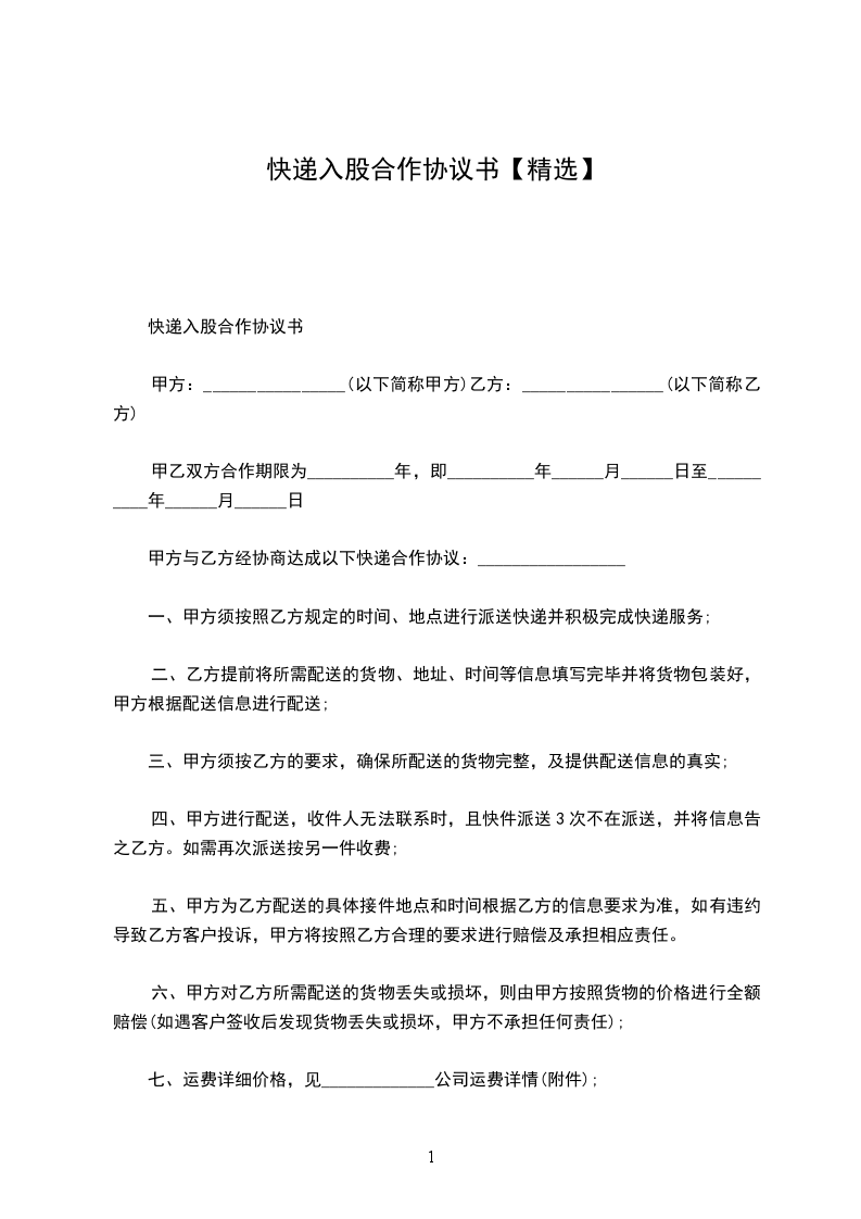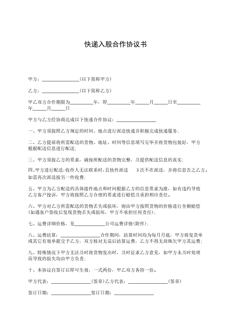 甲方:________________(以下简称甲方) 乙方:________________(以下简称乙方) 甲乙双方合作期限为__________年,即__________年______月______日至__________年______月______日 甲方与乙方经协商达成以下快递合作协议:_________________ 一、甲方须按照乙方规定的时间、地点进行派送快递并积极完成快递服务; 二、乙方提前将所需配送的货物、地址、时间等信息填写完毕并将货物包装好,甲方根据配送信息进行配送; 三、甲方须按乙方的要求,确保所配送的货物完整,及提供配送信息的真实; 四、甲方进行配送,收件人无法联系时,且快件派送3次不在派送,并将信息告之乙方。如需再次派送按另一件收费; 五、甲方为乙方配送的具体接件地点和时间根据乙方的信息要求为准,如有违约导致乙方客户投诉,甲方将按照乙方合理的要求进行赔偿及承担相应责任。 六、甲方对乙方所需配送的货物丢失或损坏,则由甲方按照货物的价格进行全额赔偿(如遇客户签收后发现货物丢失或损坏,甲方不承担任何责任); 七、运费详细价格,见_____________公司运费详情(附件); 八、运费结算:_________________合作期间,结算时间均为每月月底,甲方将发货单或其它有效单据交予乙方,双方核对无误后结算运费,乙方不得无故拖欠甲方其运费; 九、特殊情况下甲方无法及时将货物发出时,及时征求乙方意见,如甲方未及时处理而导致的损失均由甲方负责; 十、本协议自签订后即可生效,一式两份,甲乙双方各持一份。 甲方代表:_________________(签章)乙方代表:_________________(签章) 签订日期:_________________签订日期:_________________
