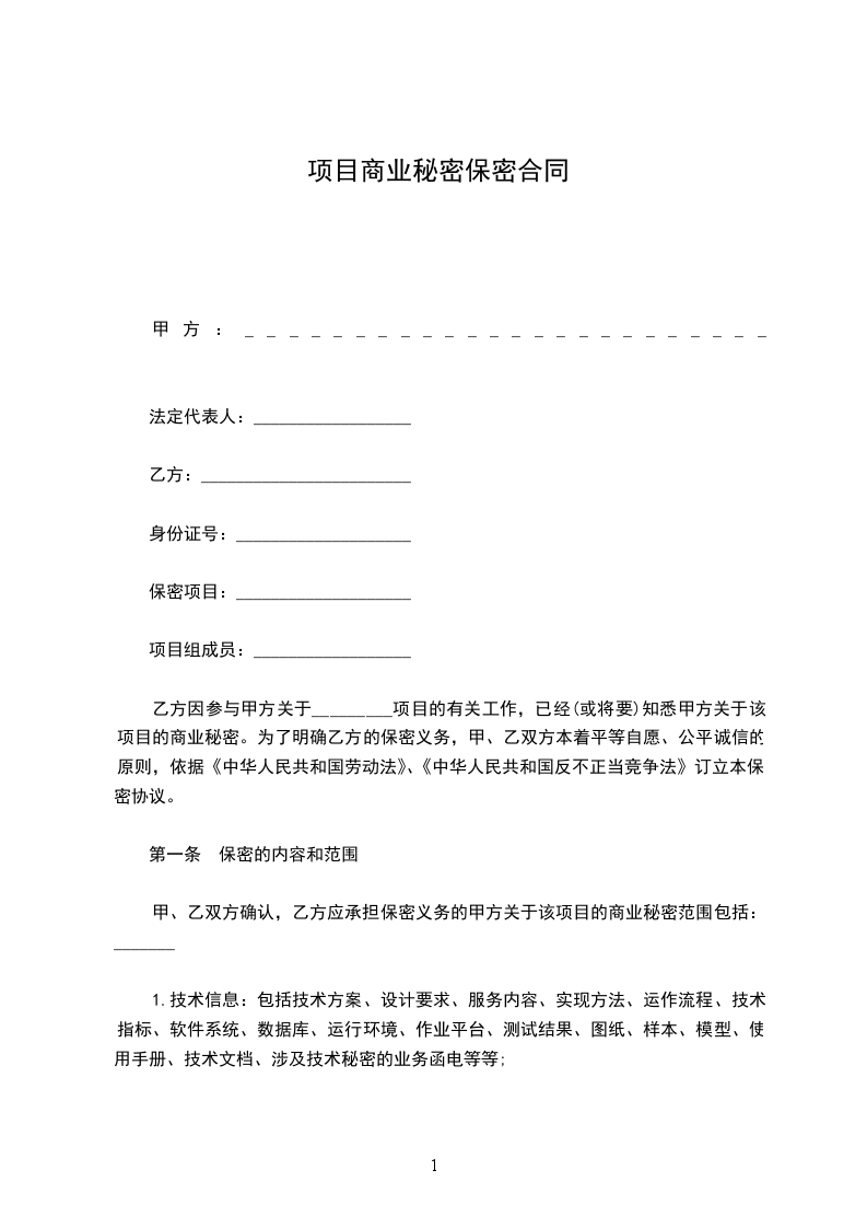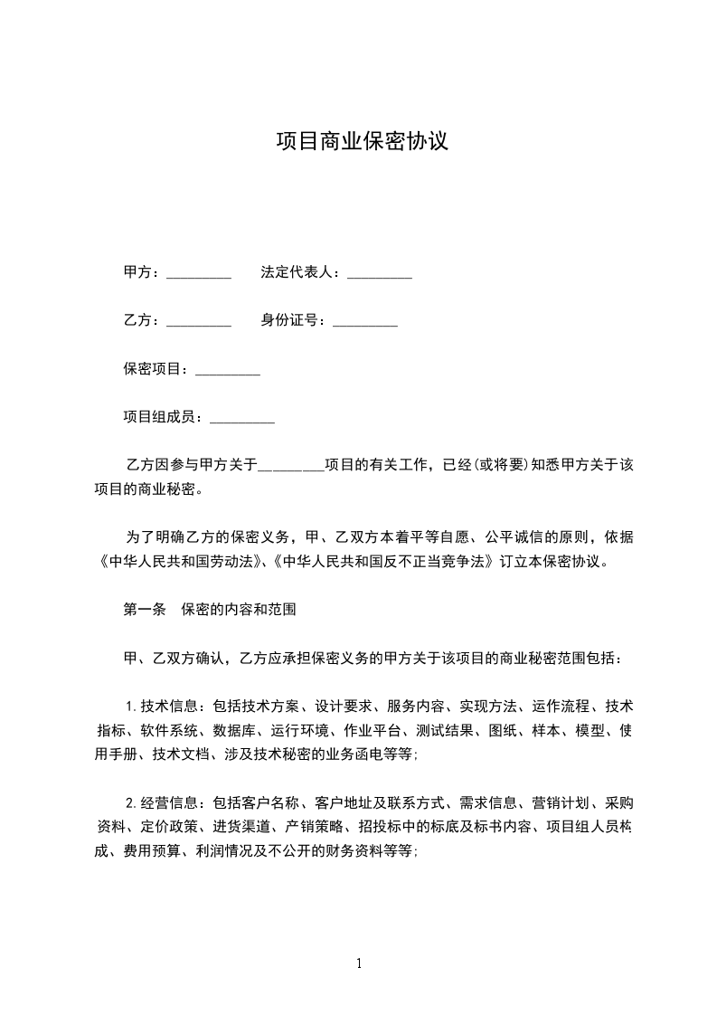 乙方因参与甲方关于_________项目的有关工作,已经(或将要)知悉甲方关于该项目的商业秘密。为了明确乙方的保密义务,甲、乙双方本着平等自愿、公平诚信的原则,依据《中华人民共和国劳动法》、《中华人民共和国反不正当竞争法》订立本保密协议。